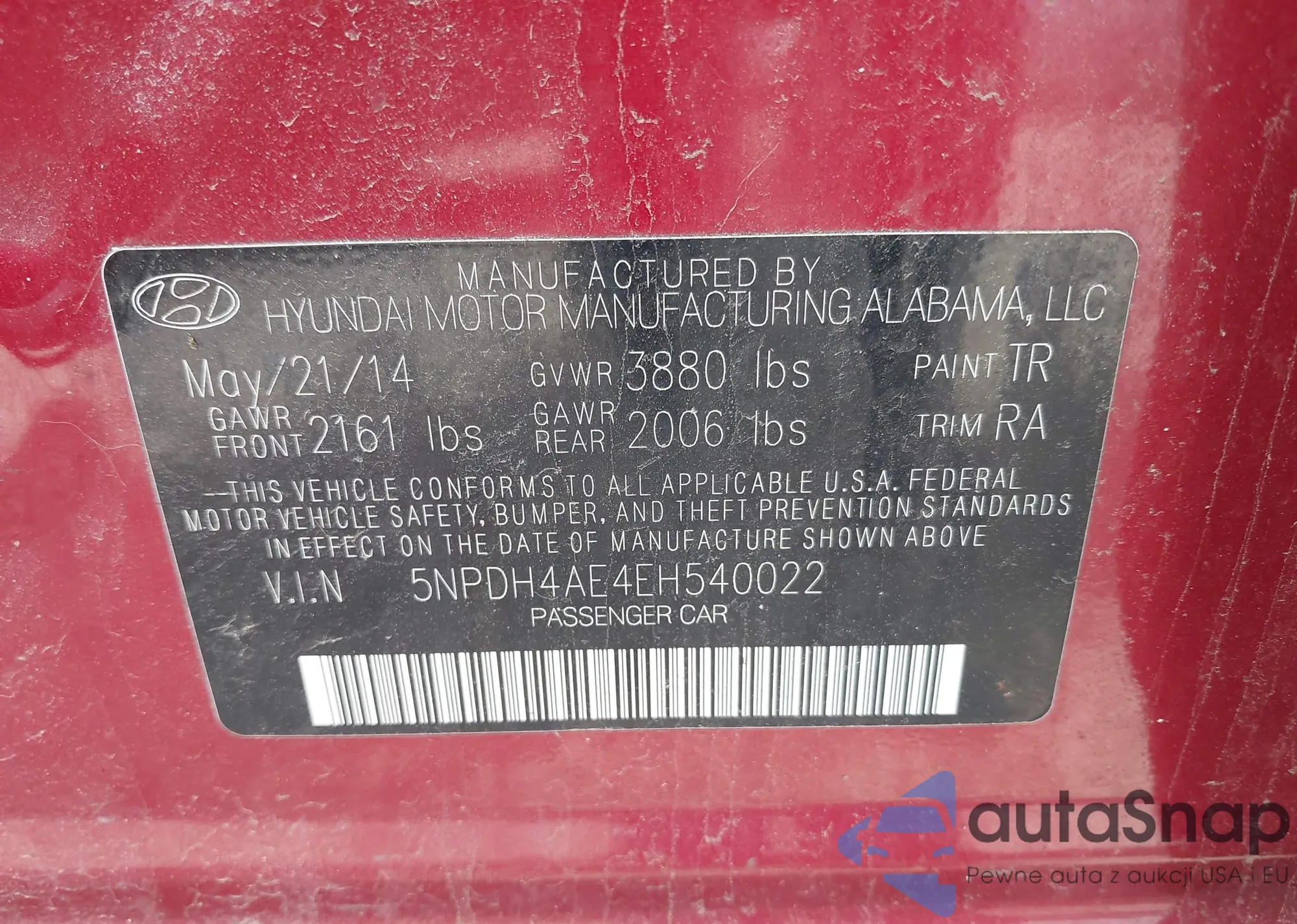 LOT: 42041773 VIN: 5NPDH4AE4EH540022