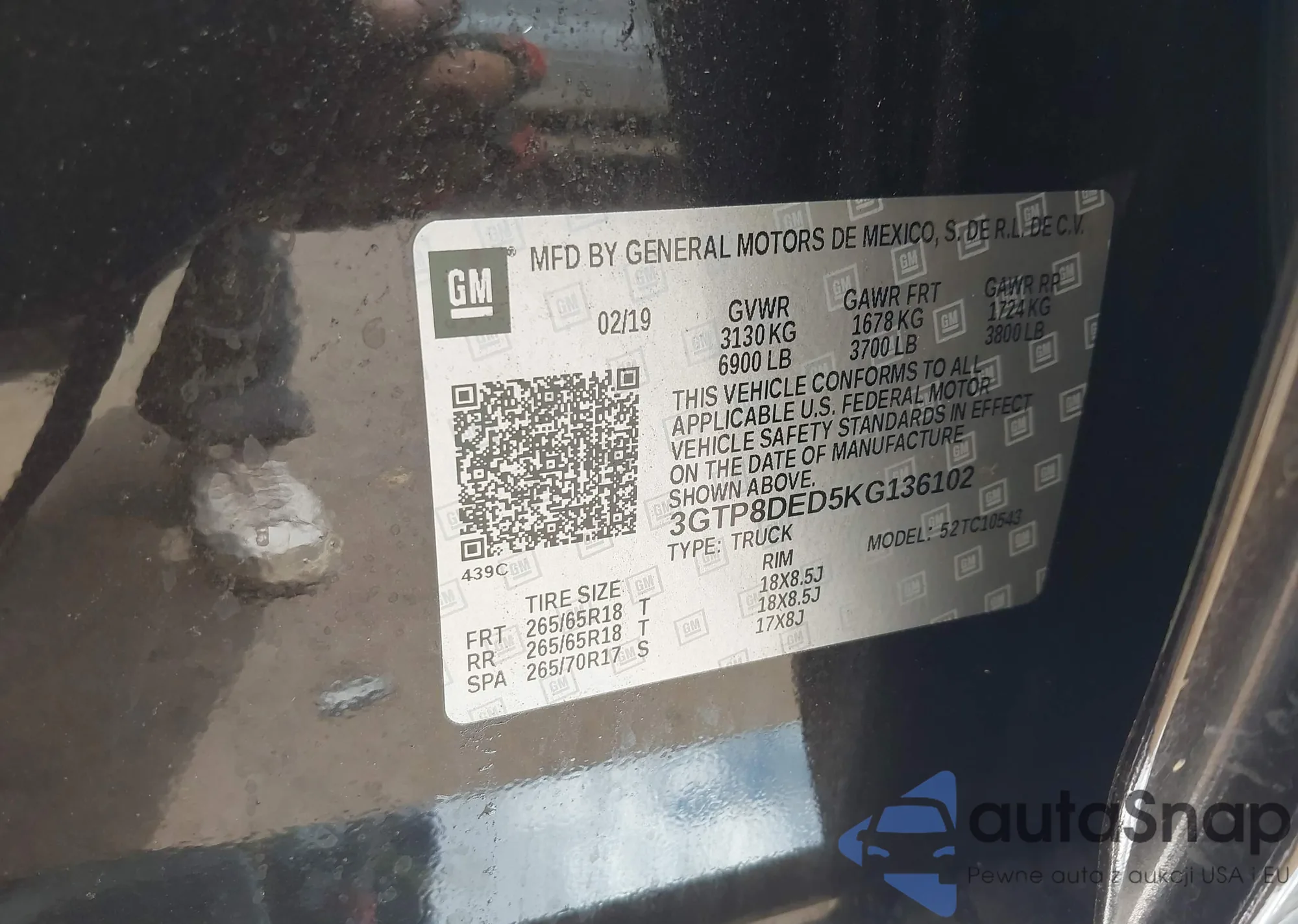 LOT: 42555456 VIN: 3GTP8DED5KG136102
