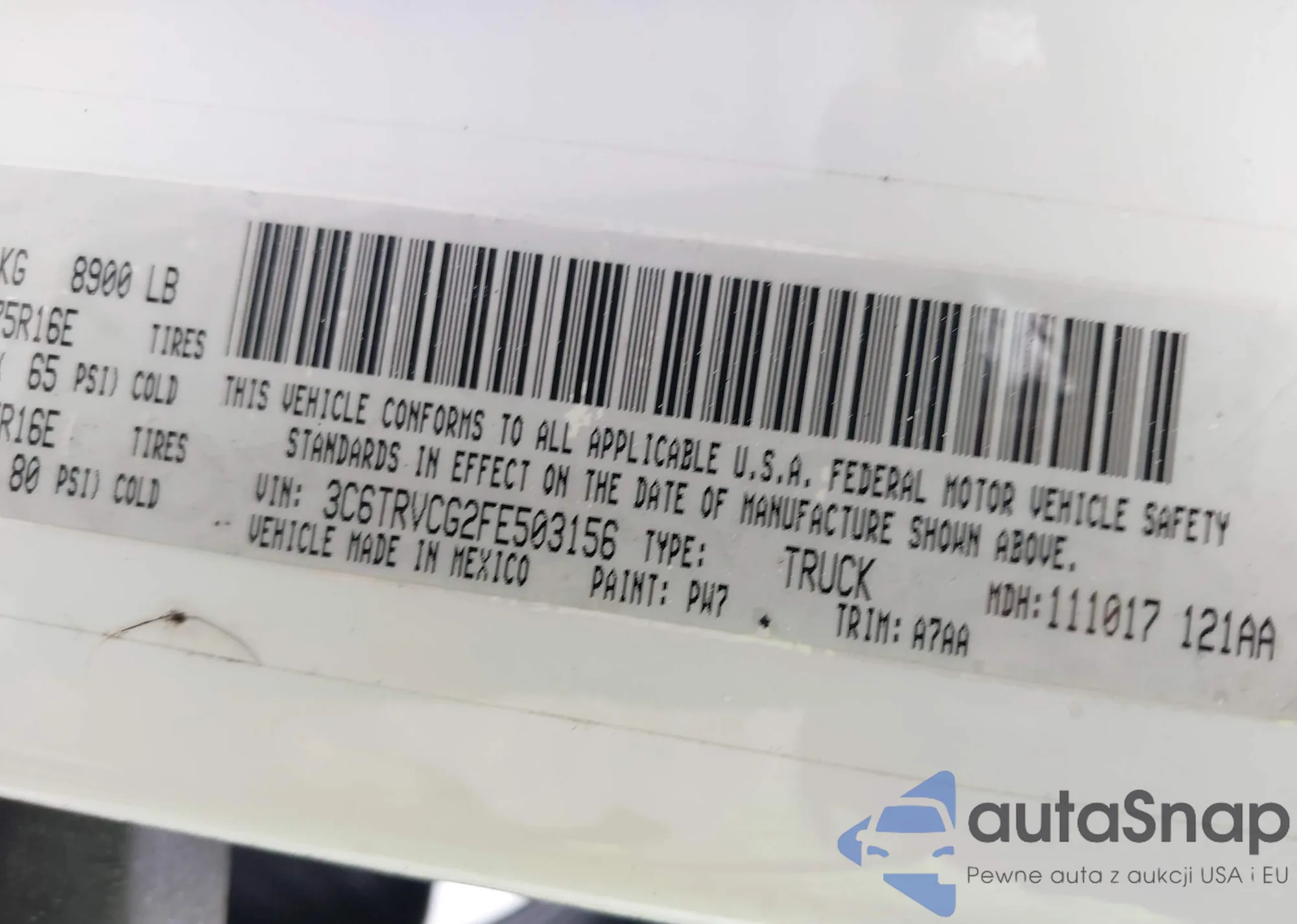 LOT: 42081368 VIN: 3C6TRVCG2FE503156