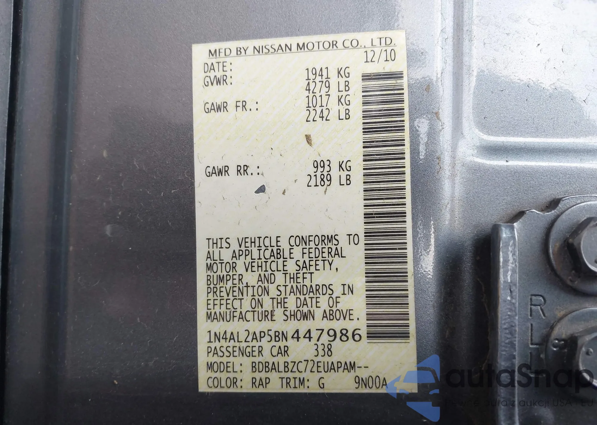 LOT: 42612588 VIN: 1N4AL2AP5BN447986