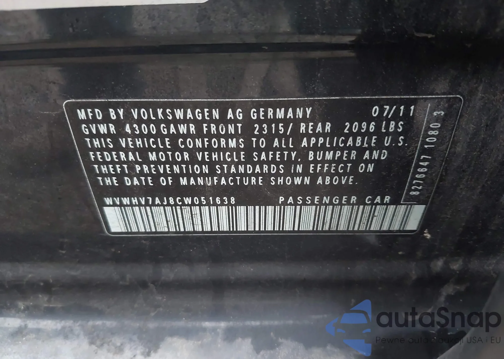 • VIN WVWHV7AJ8CW051638