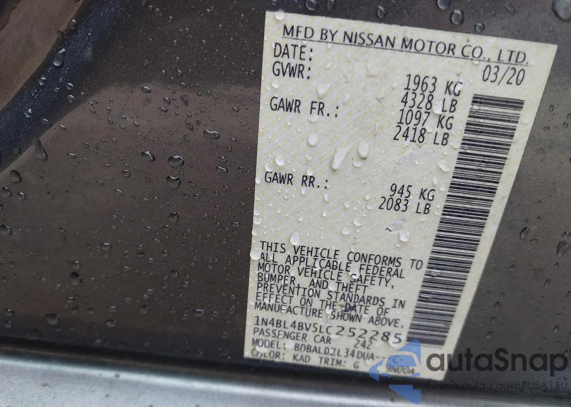 LOT: 42506706 VIN: 1N4BL4BV5LC252285