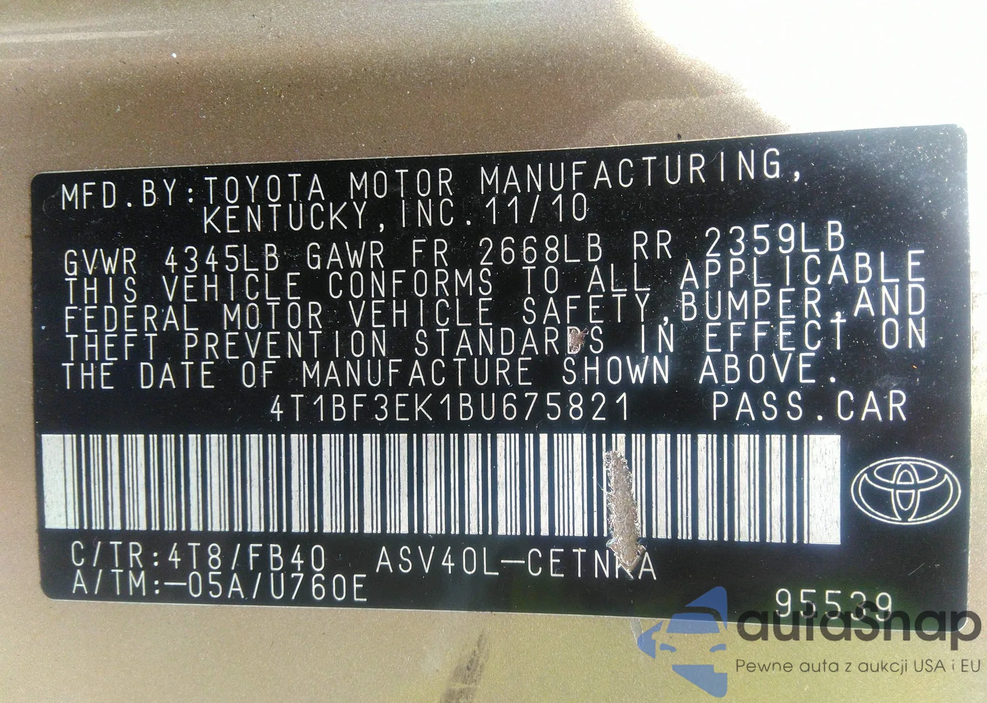 • VIN 4T1BF3EK1BU675821