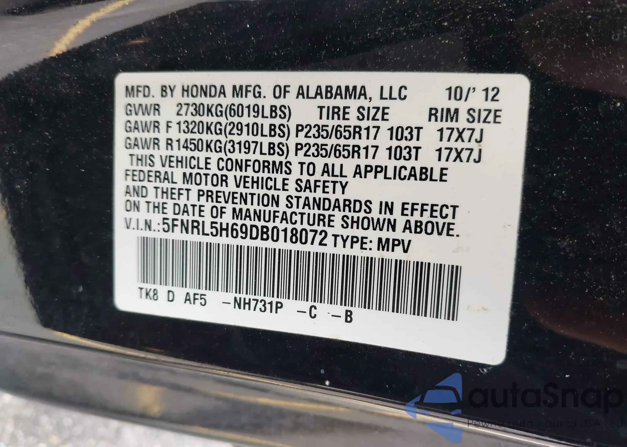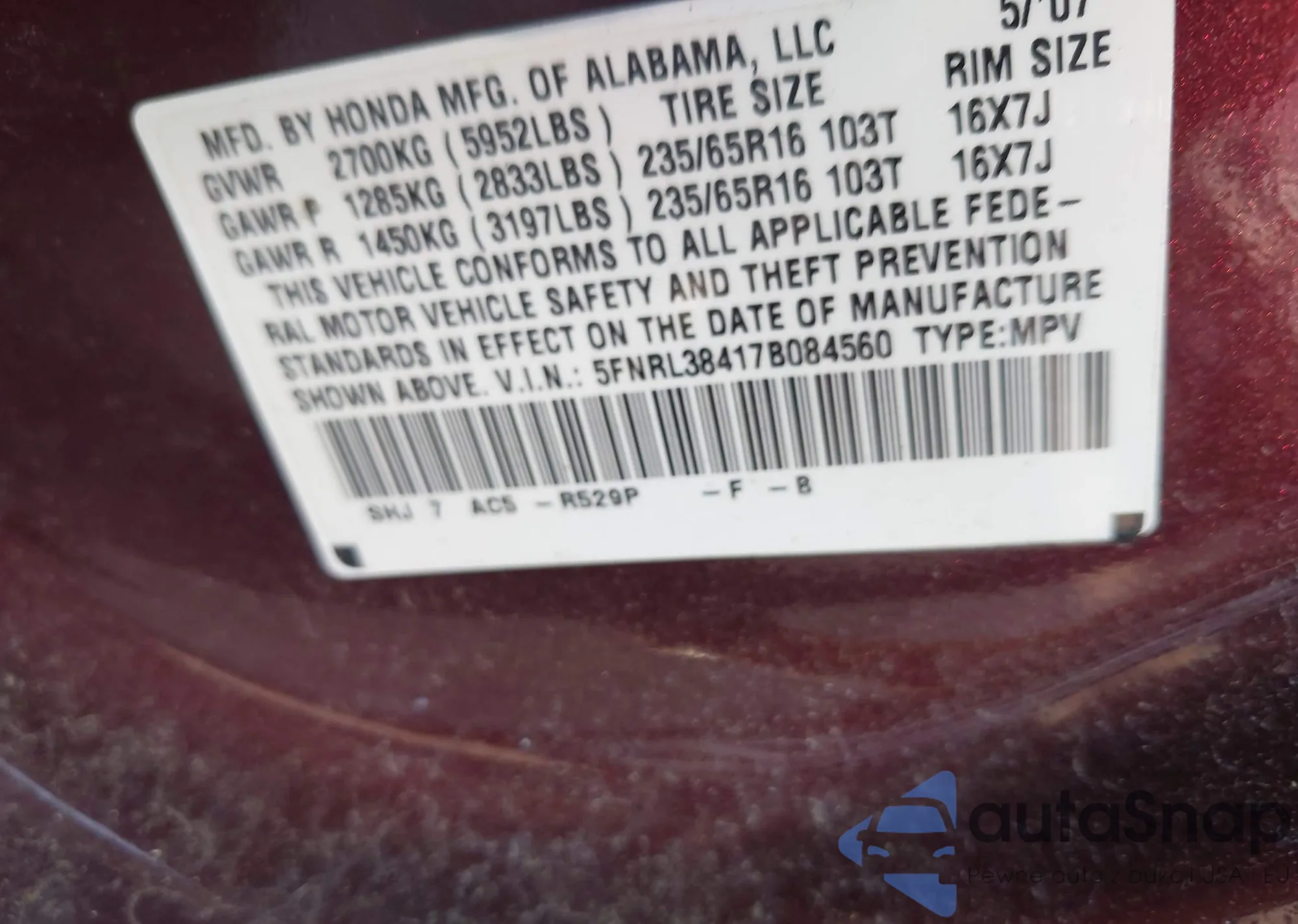 • VIN 5FNRL38417B084560