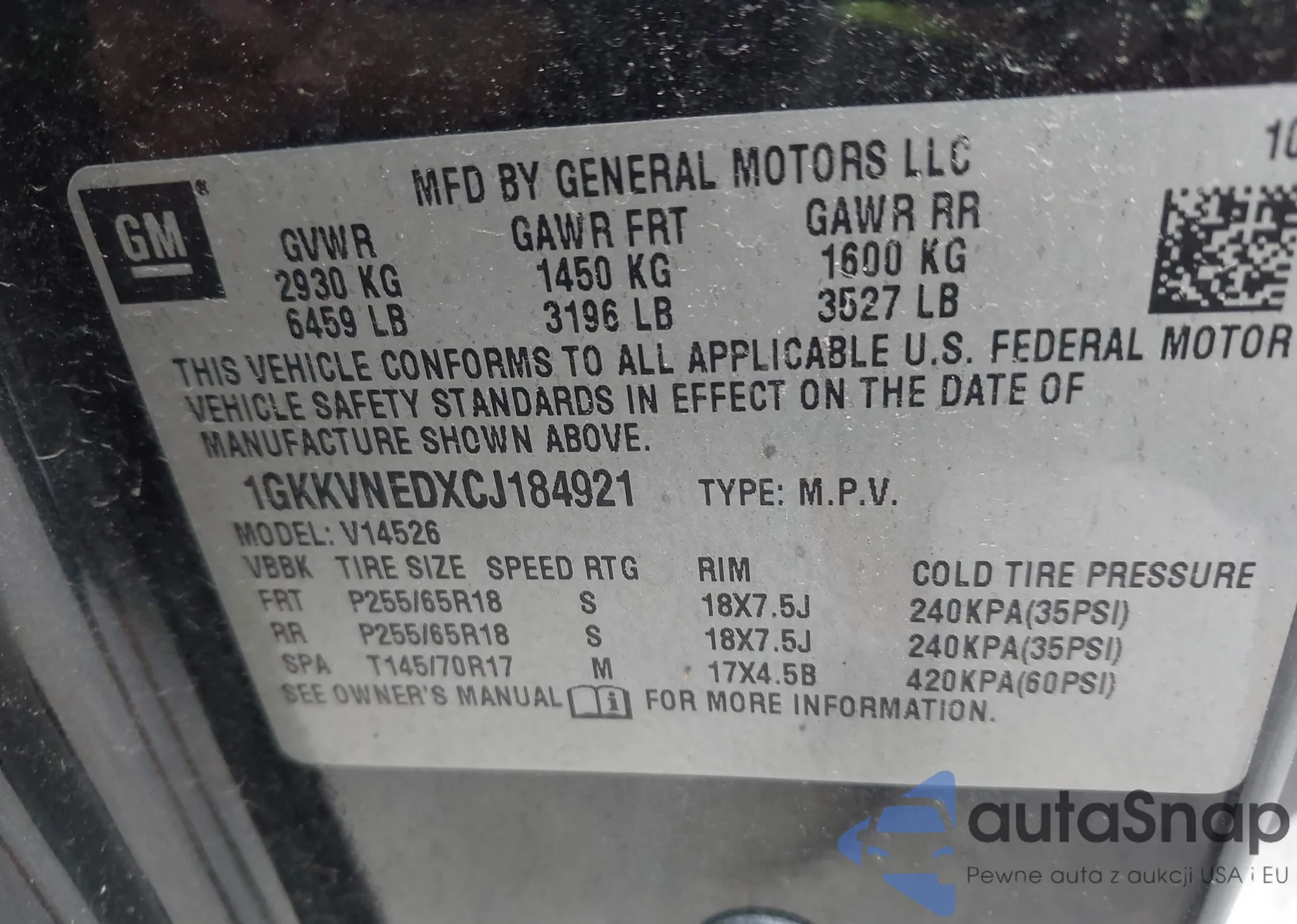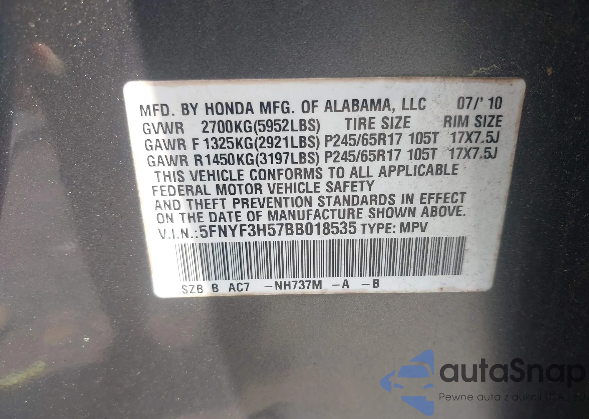 • VIN 5FNYF3H57BB018535