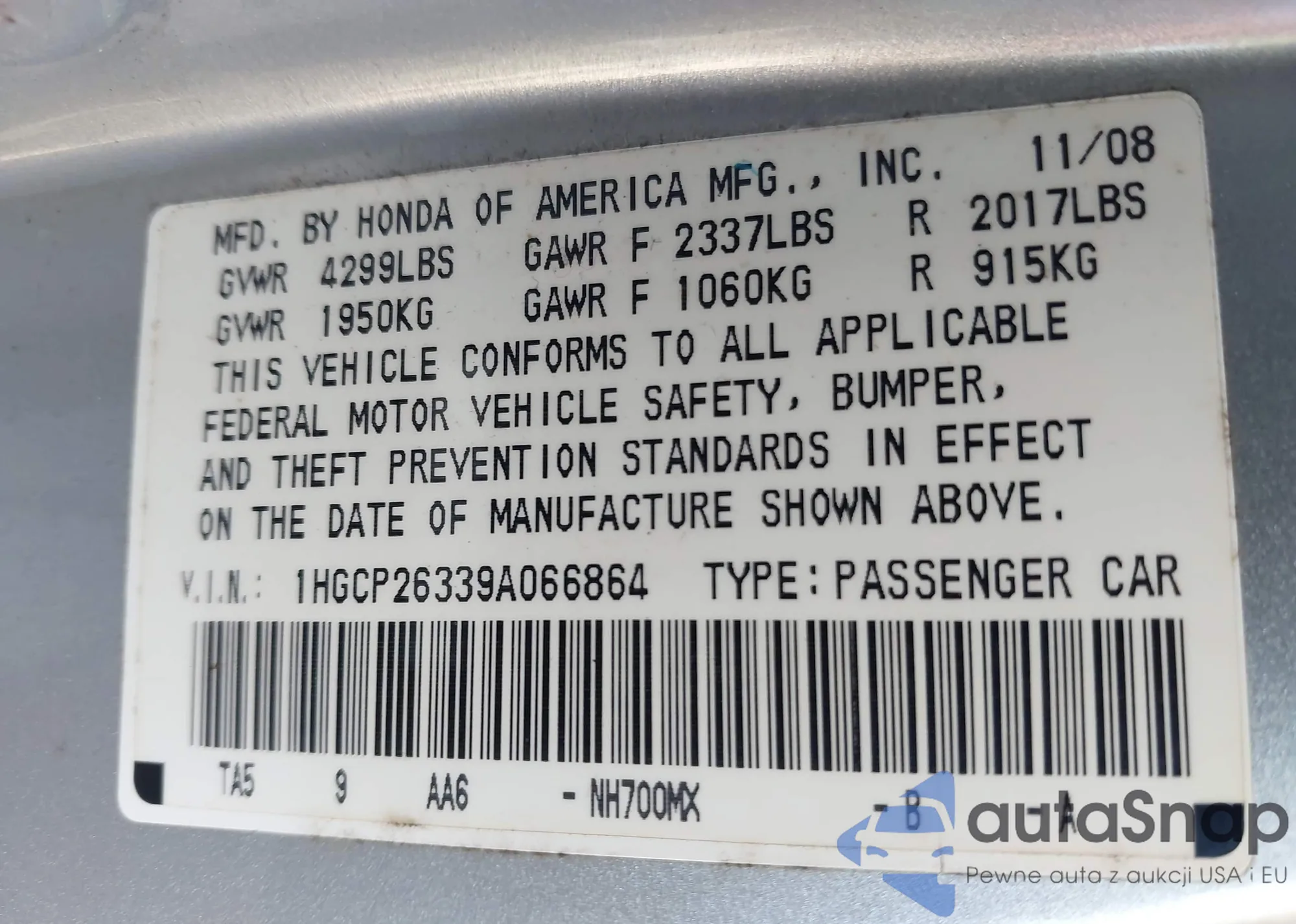 LOT: 42643843 VIN: 1HGCP26339A066864