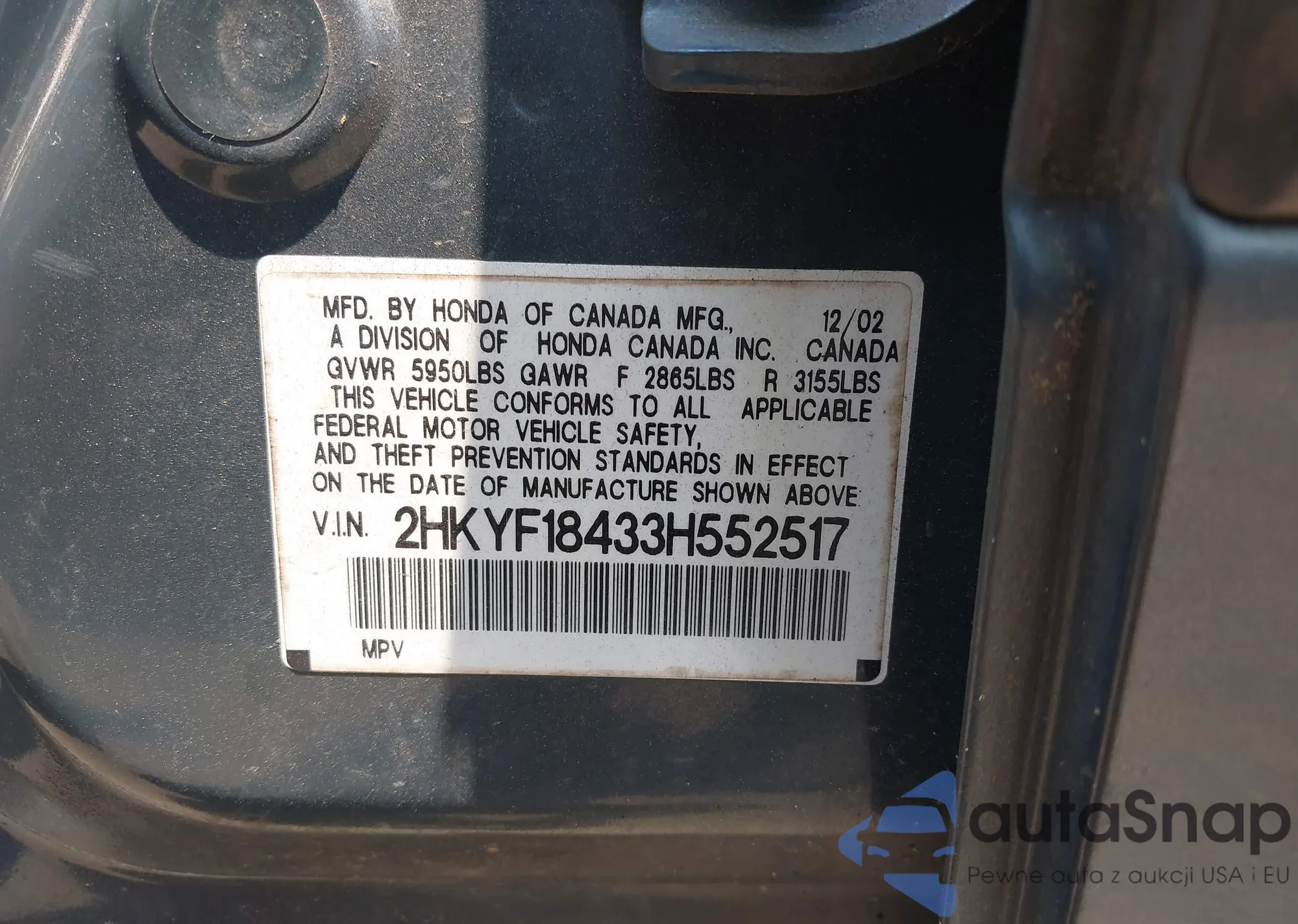 • VIN 2HKYF18433H552517