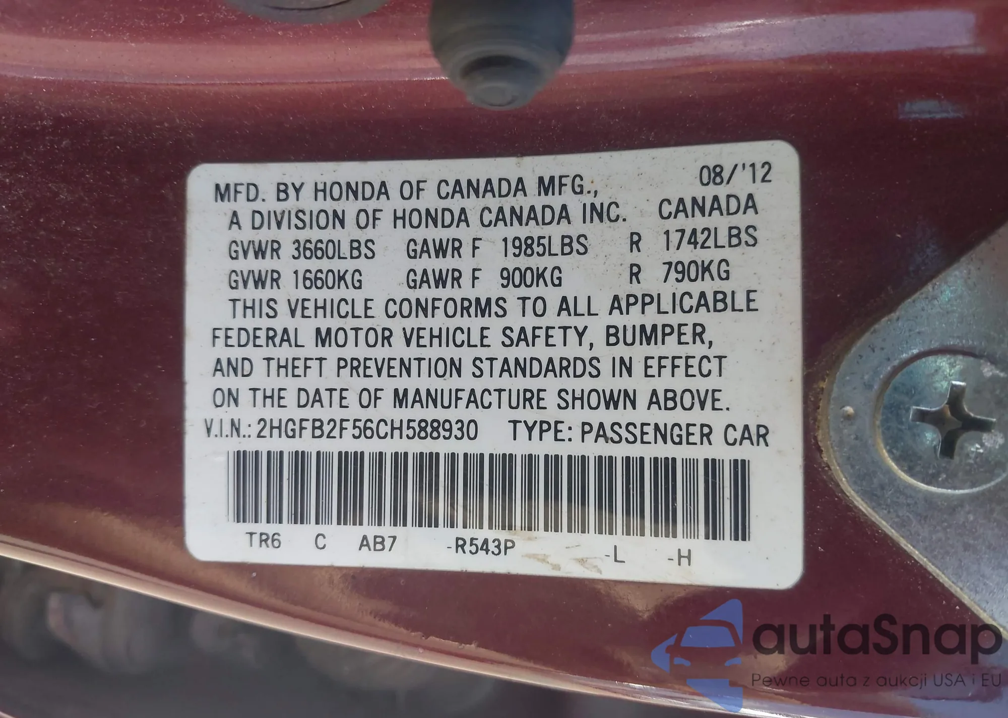 LOT: 42699277 VIN: 2HGFB2F56CH588930