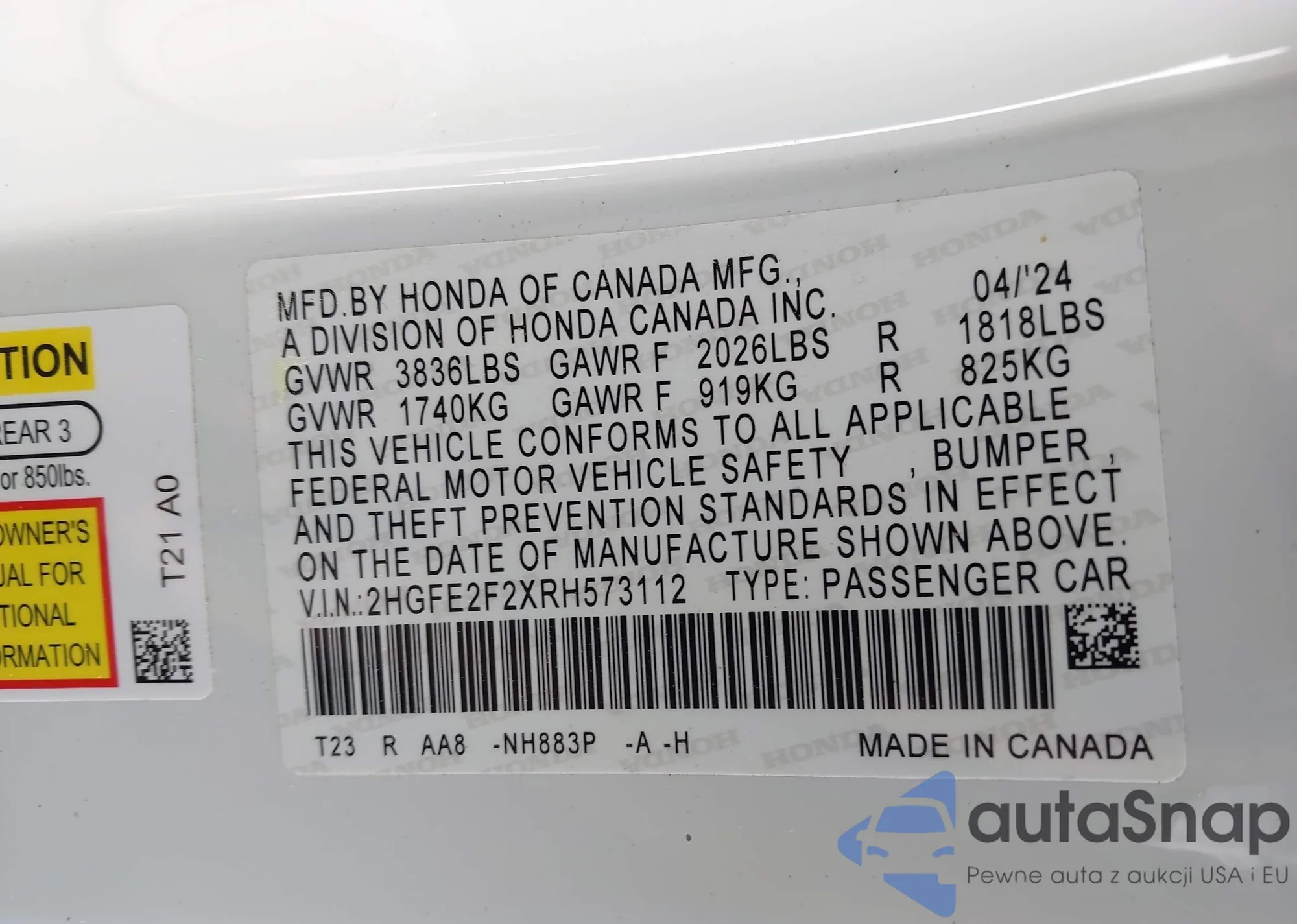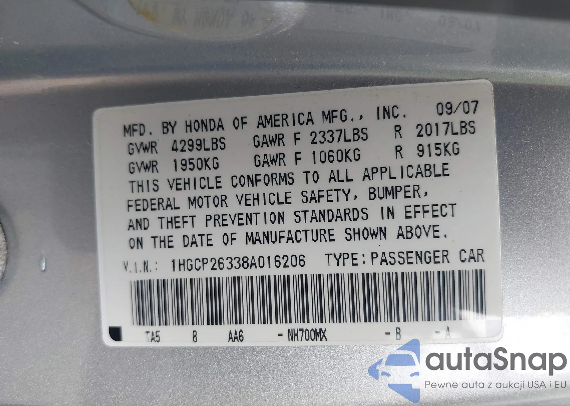 LOT: 42798622 VIN: 1HGCP26338A016206