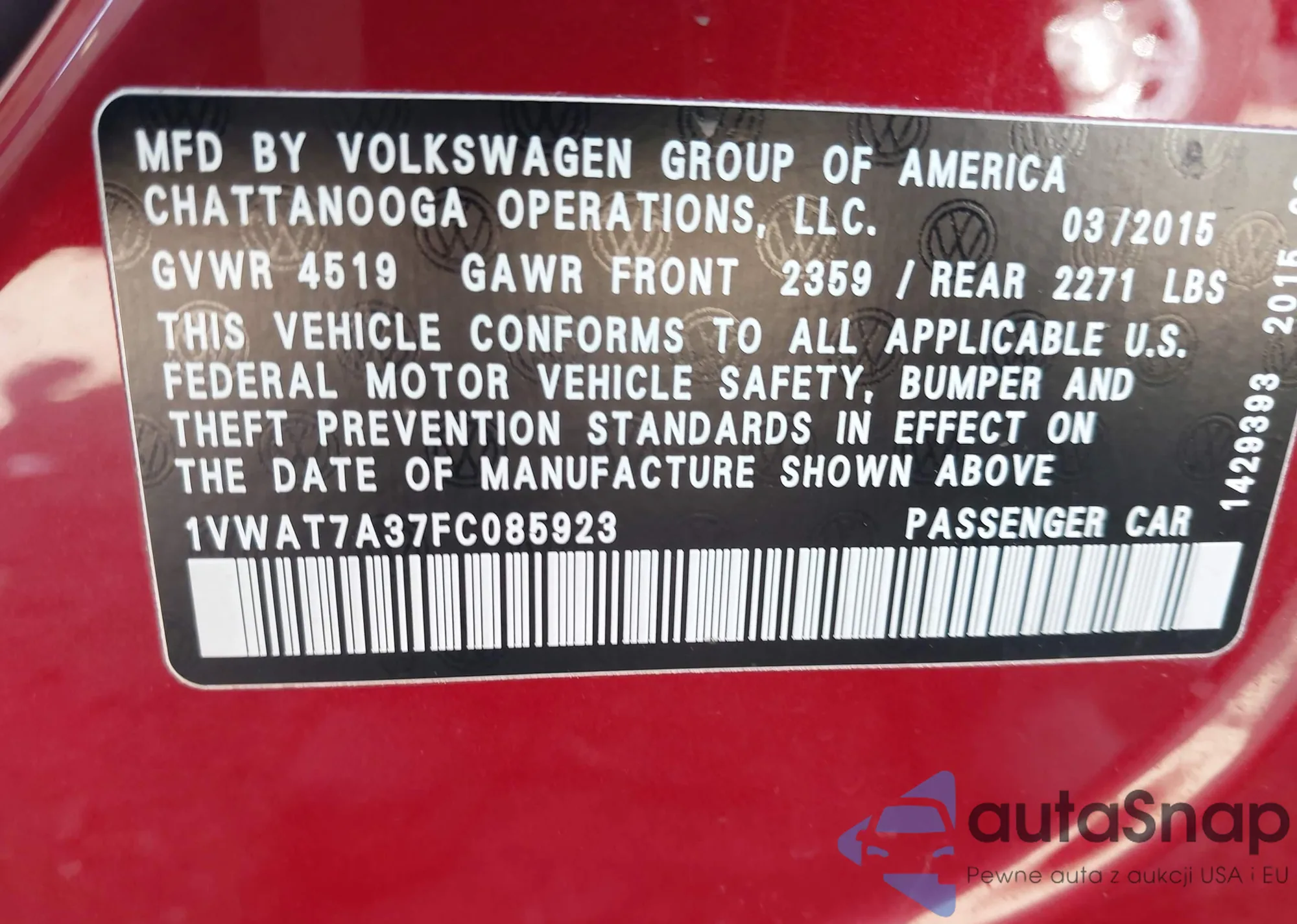 LOT: 42611551 VIN: 1VWAT7A37FC085923