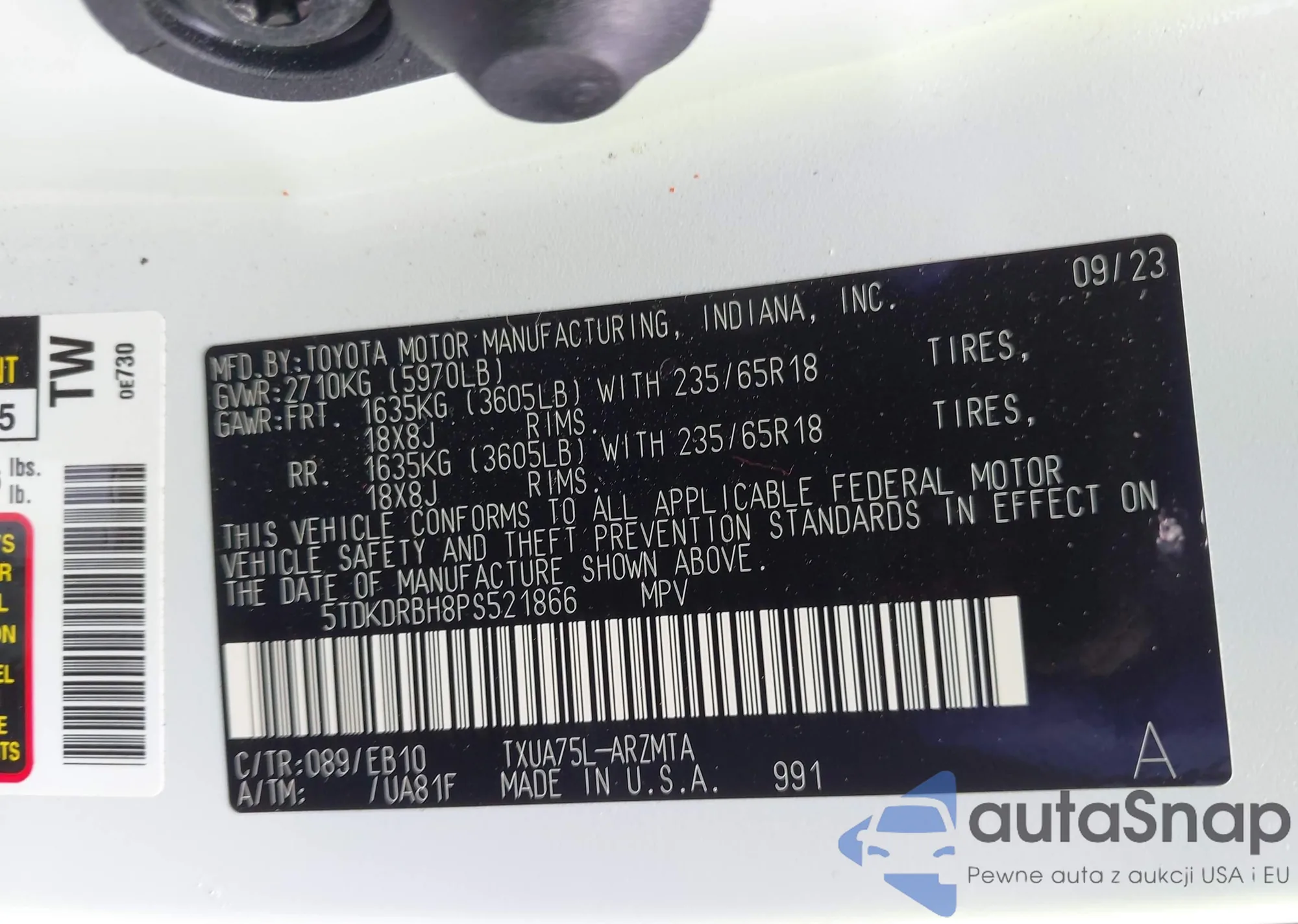 LOT: 42613541 VIN: 5TDKDRBH8PS521866