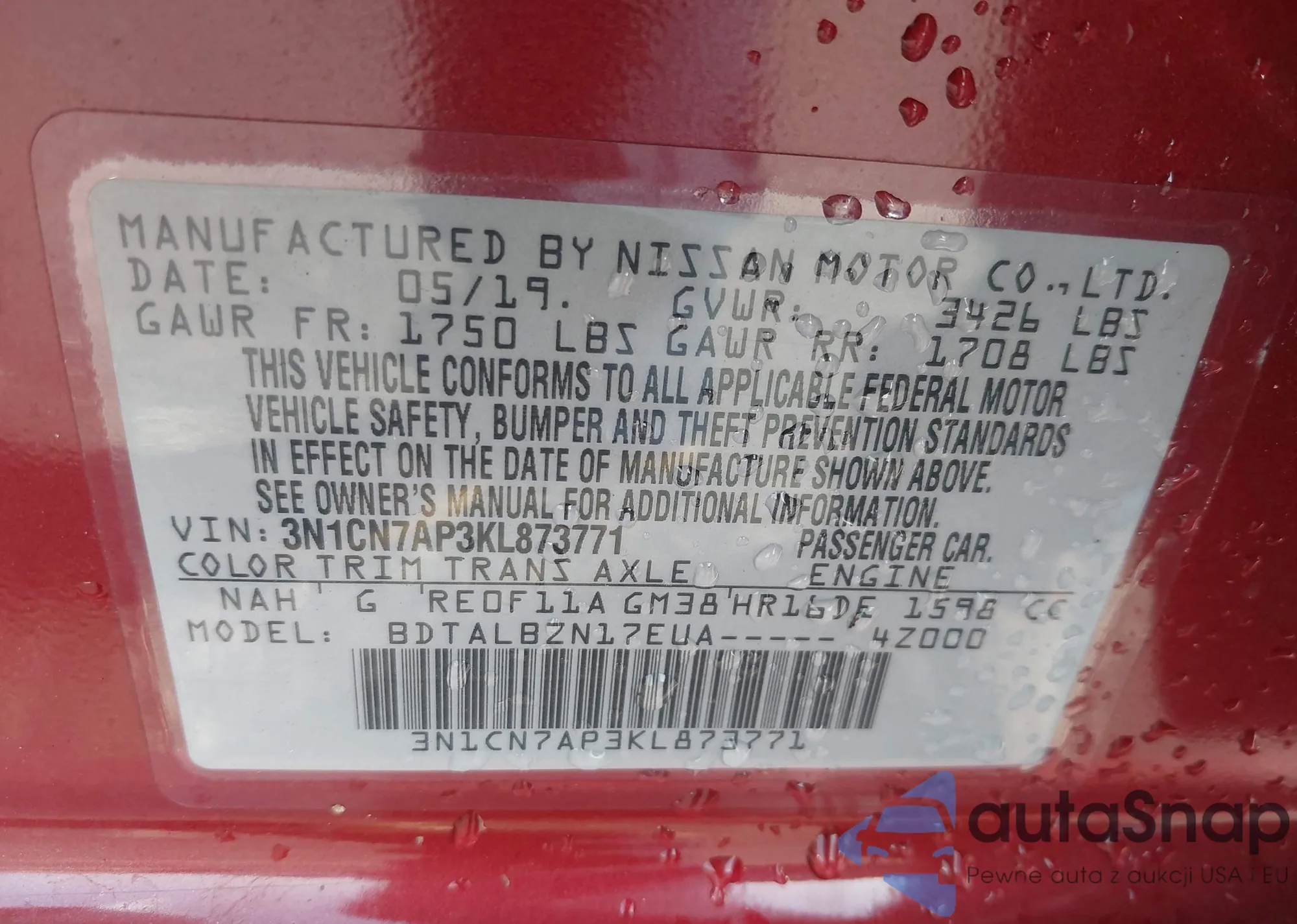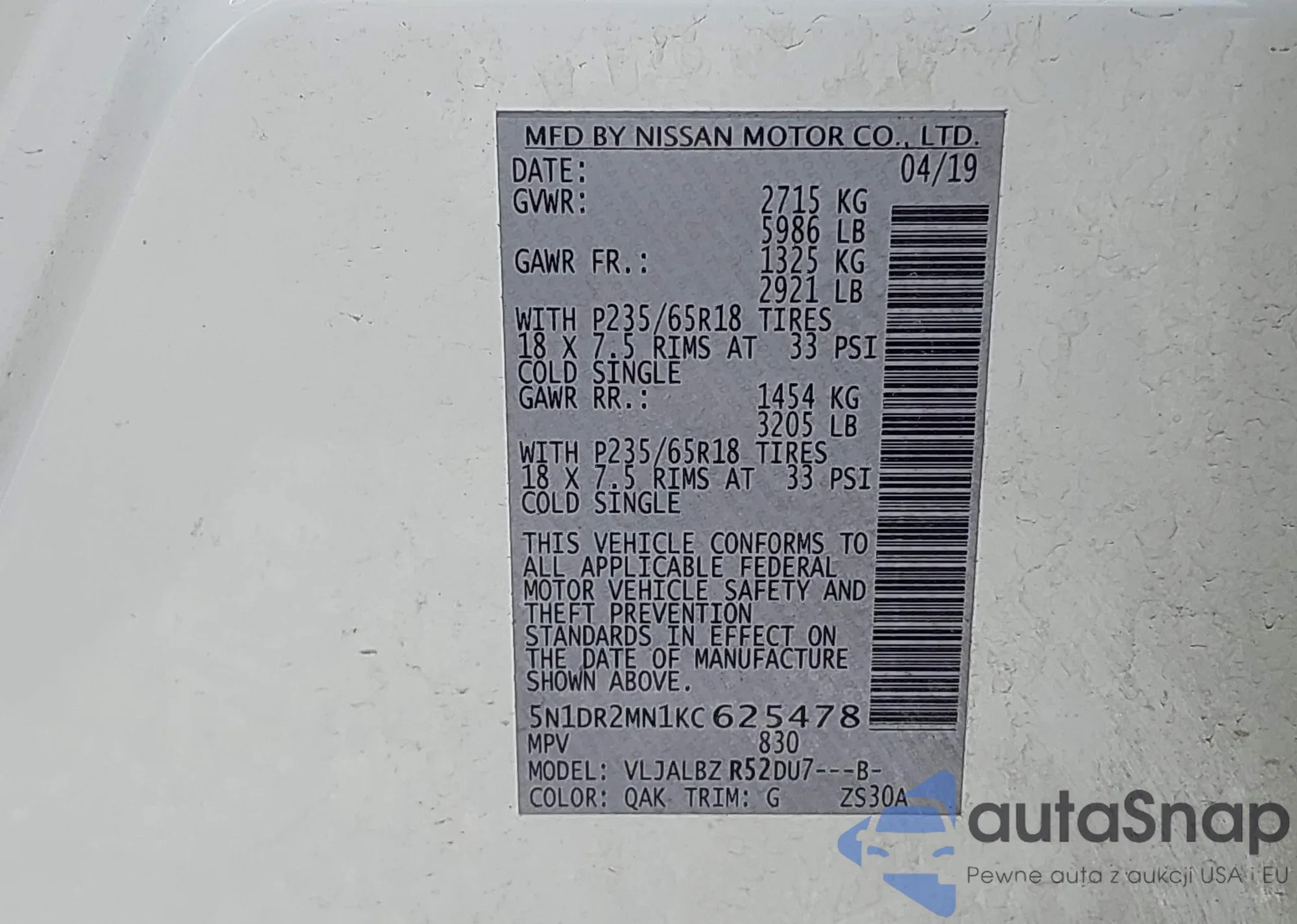 • VIN 5N1DR2MN1KC625478