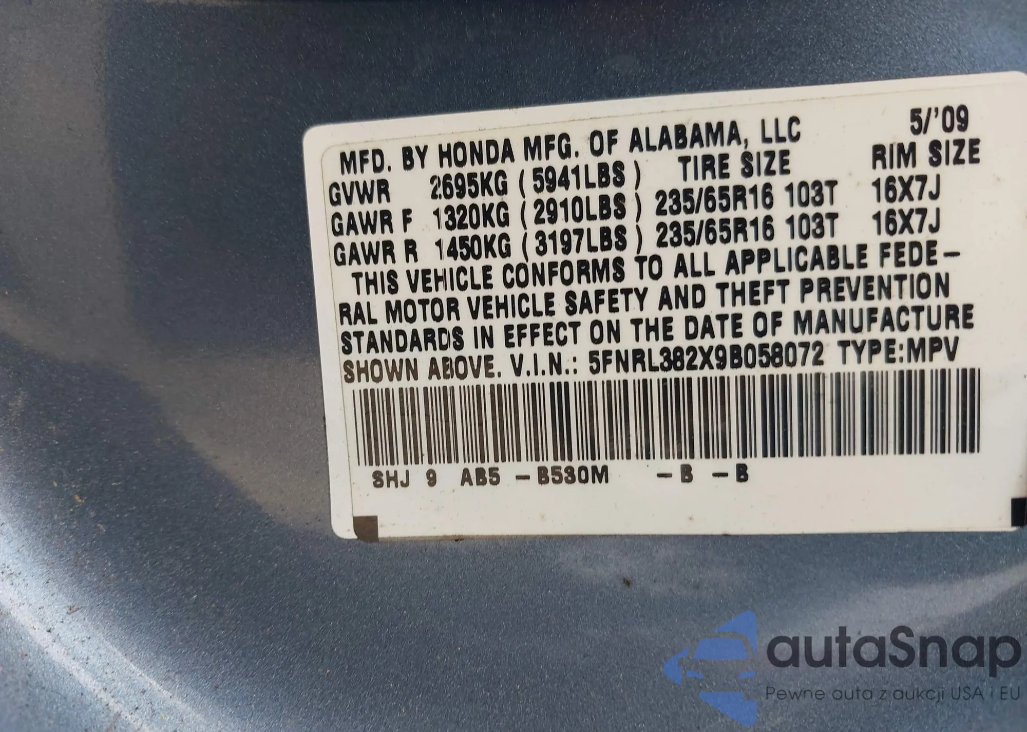 • VIN 5FNRL382X9B058072