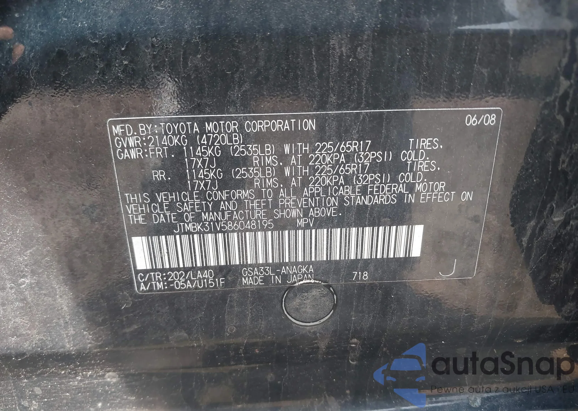 LOT: 42866795 VIN: JTMBK31V586048195