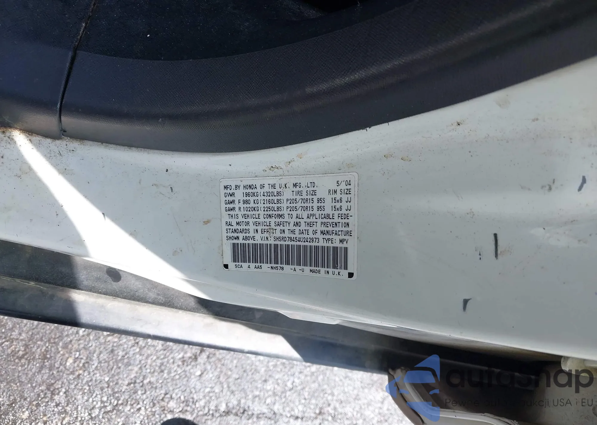 • VIN 5J6RE48578L000985