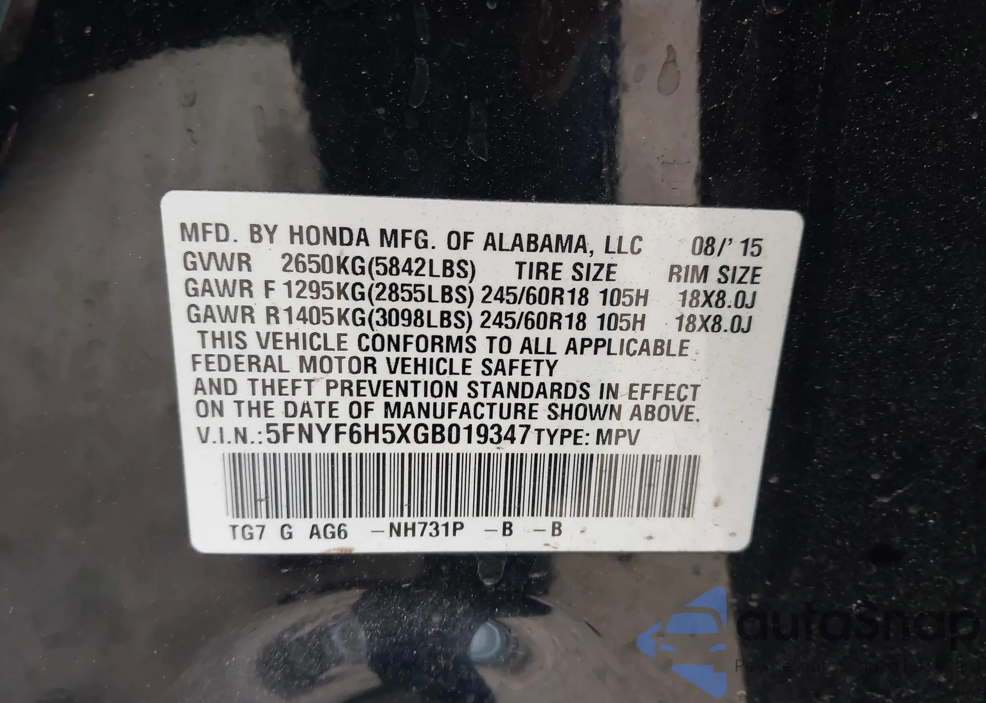 • VIN 5FNYF6H5XGB019347