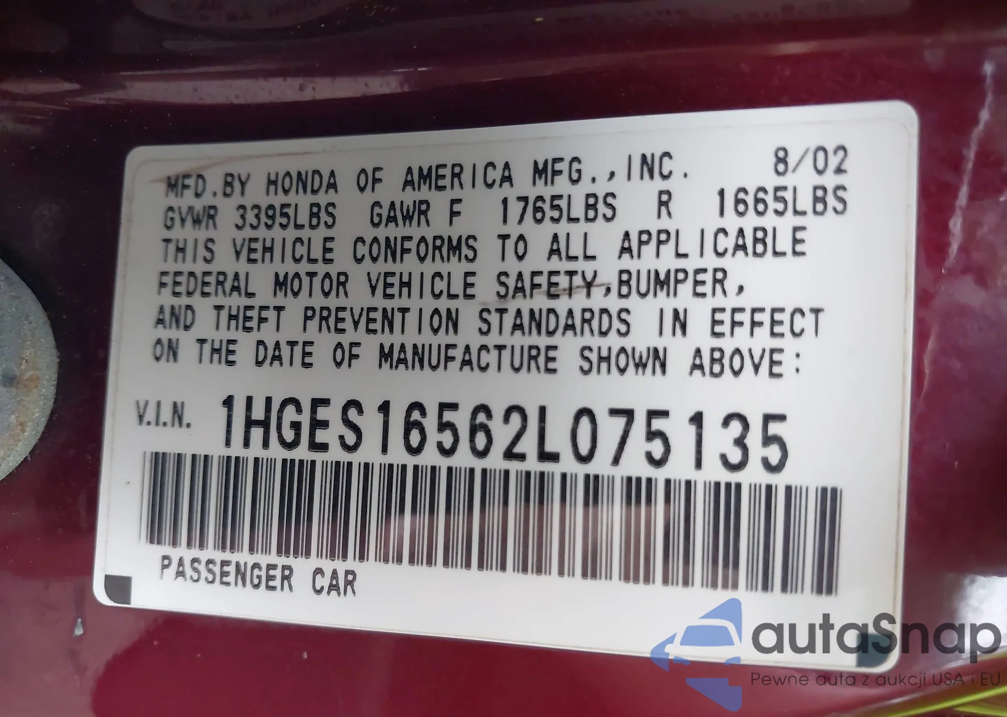LOT: 42751570 VIN: 1HGES16562L075135