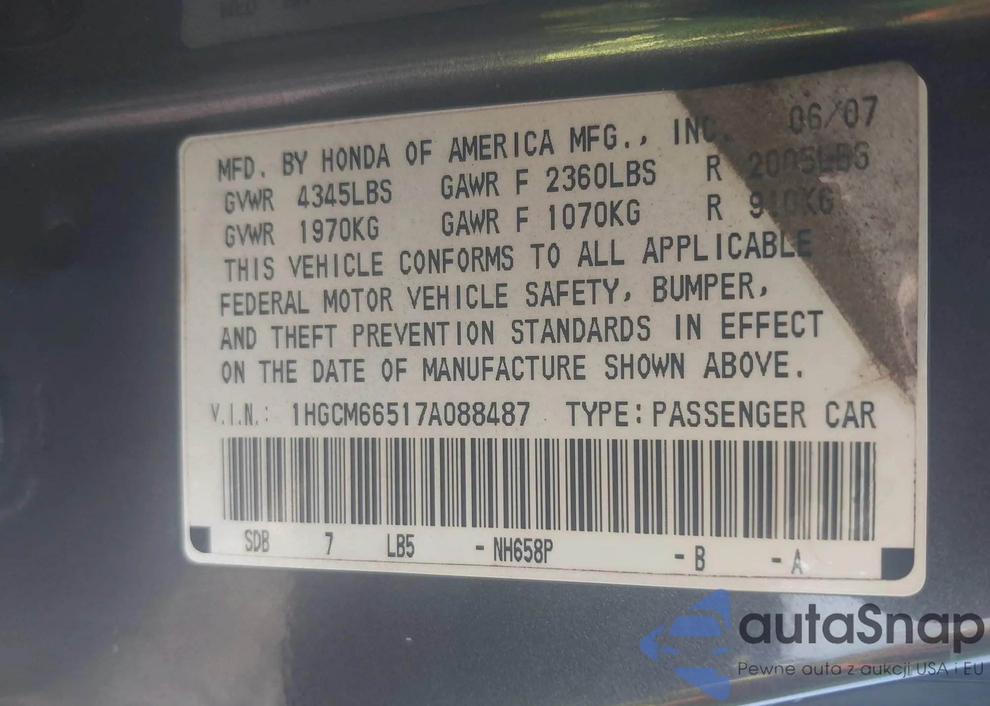 LOT: 42832579 VIN: 1HGCM66517A088487