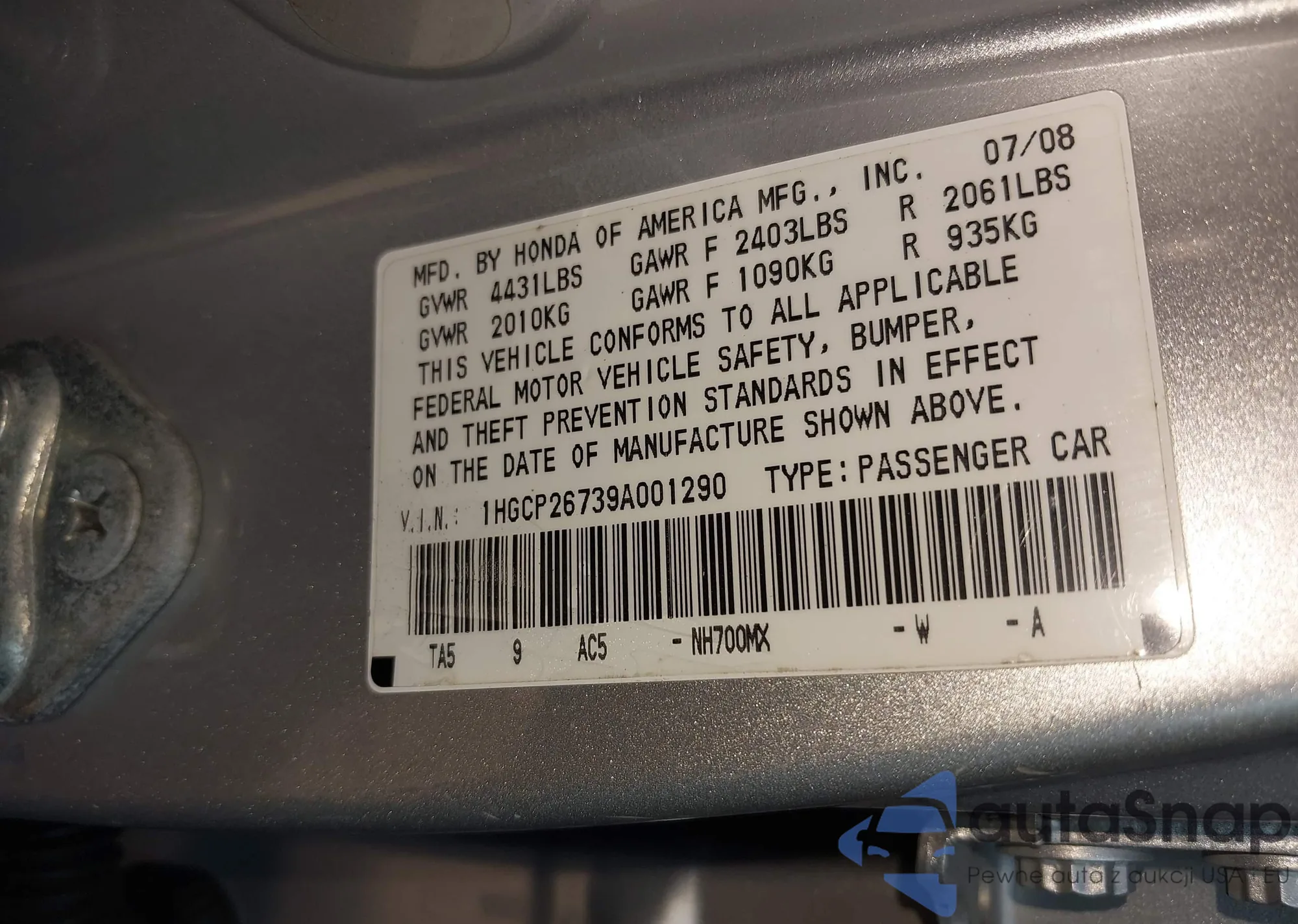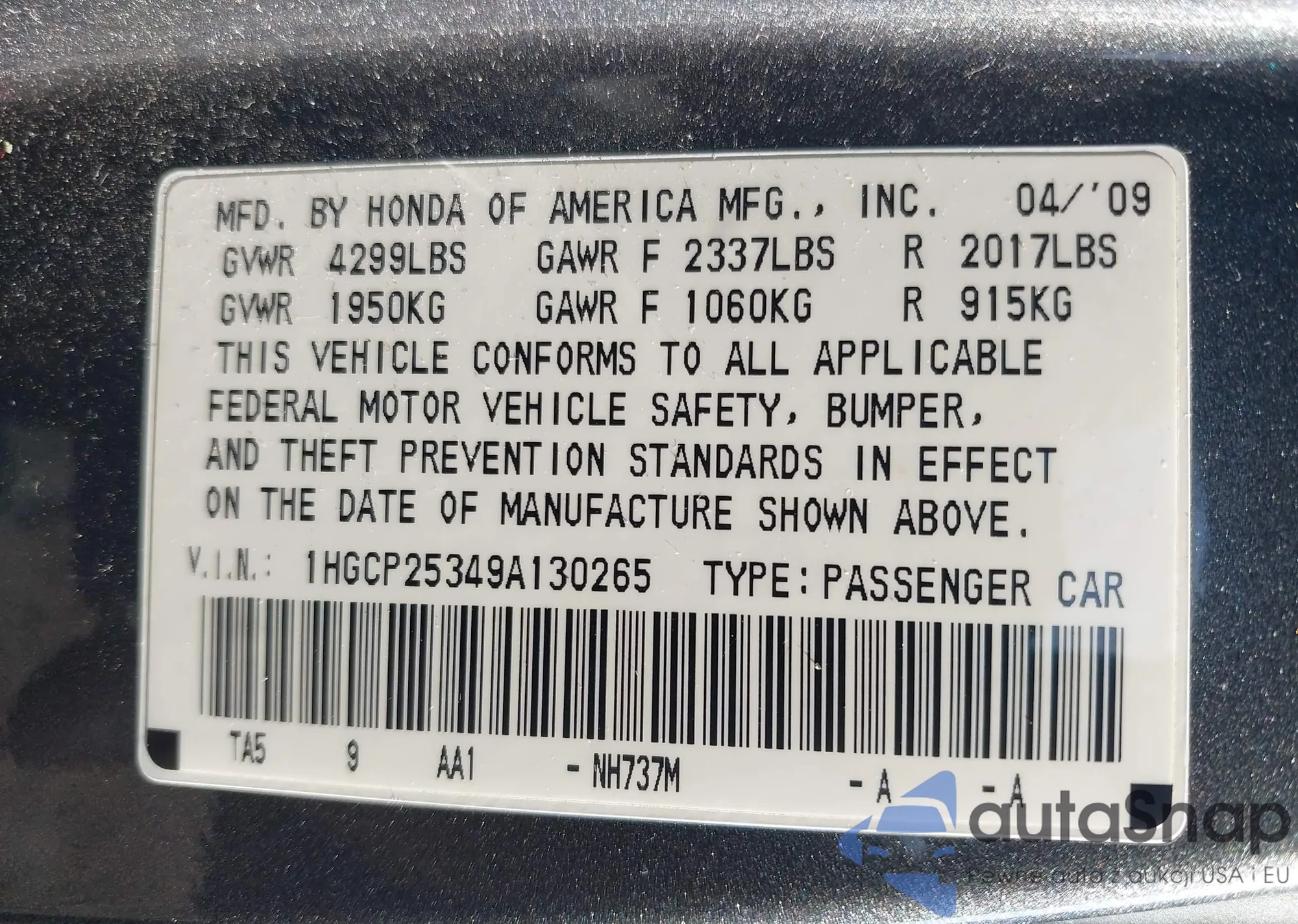 LOT: 42661820 VIN: 1HGCP25349A130265