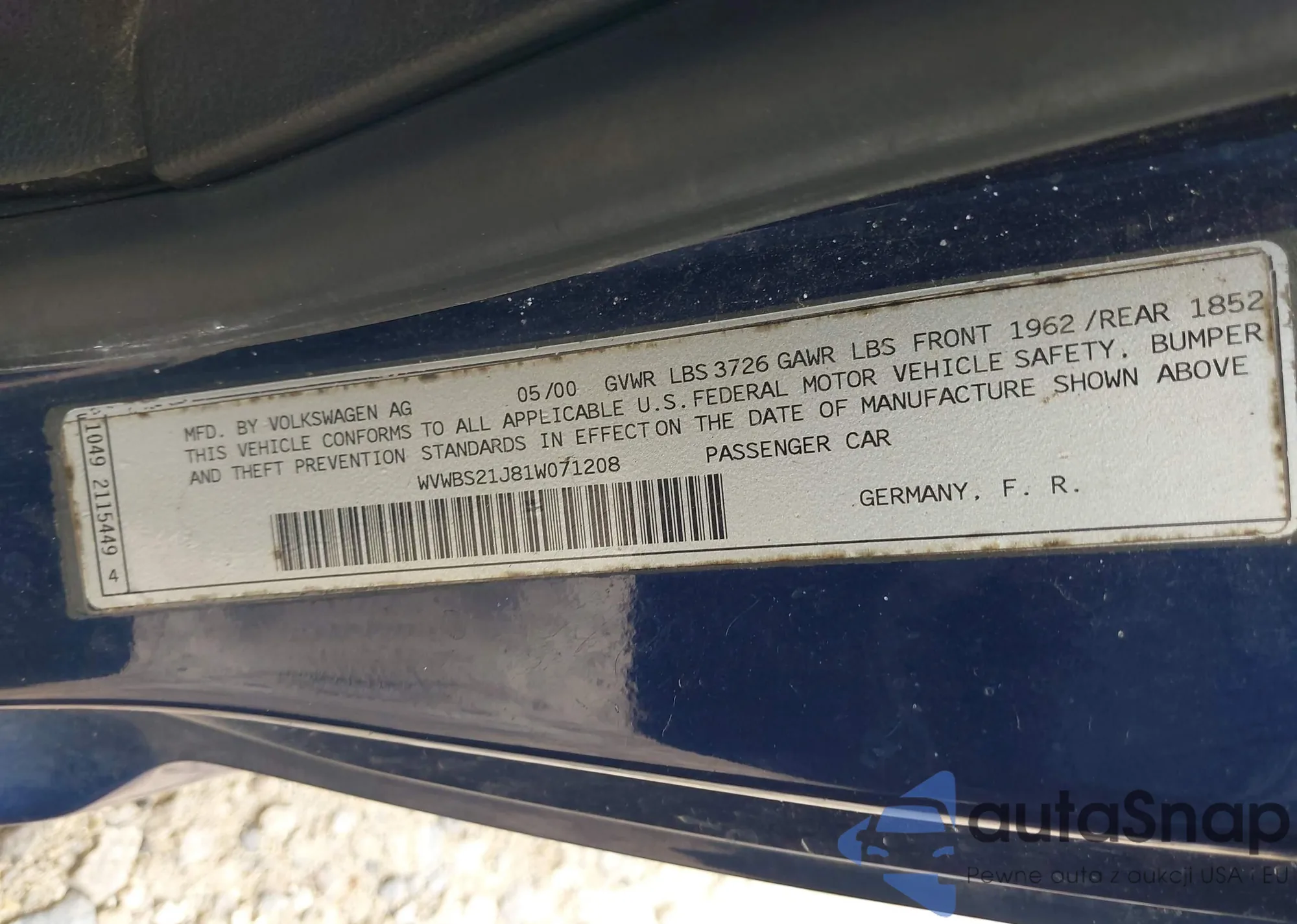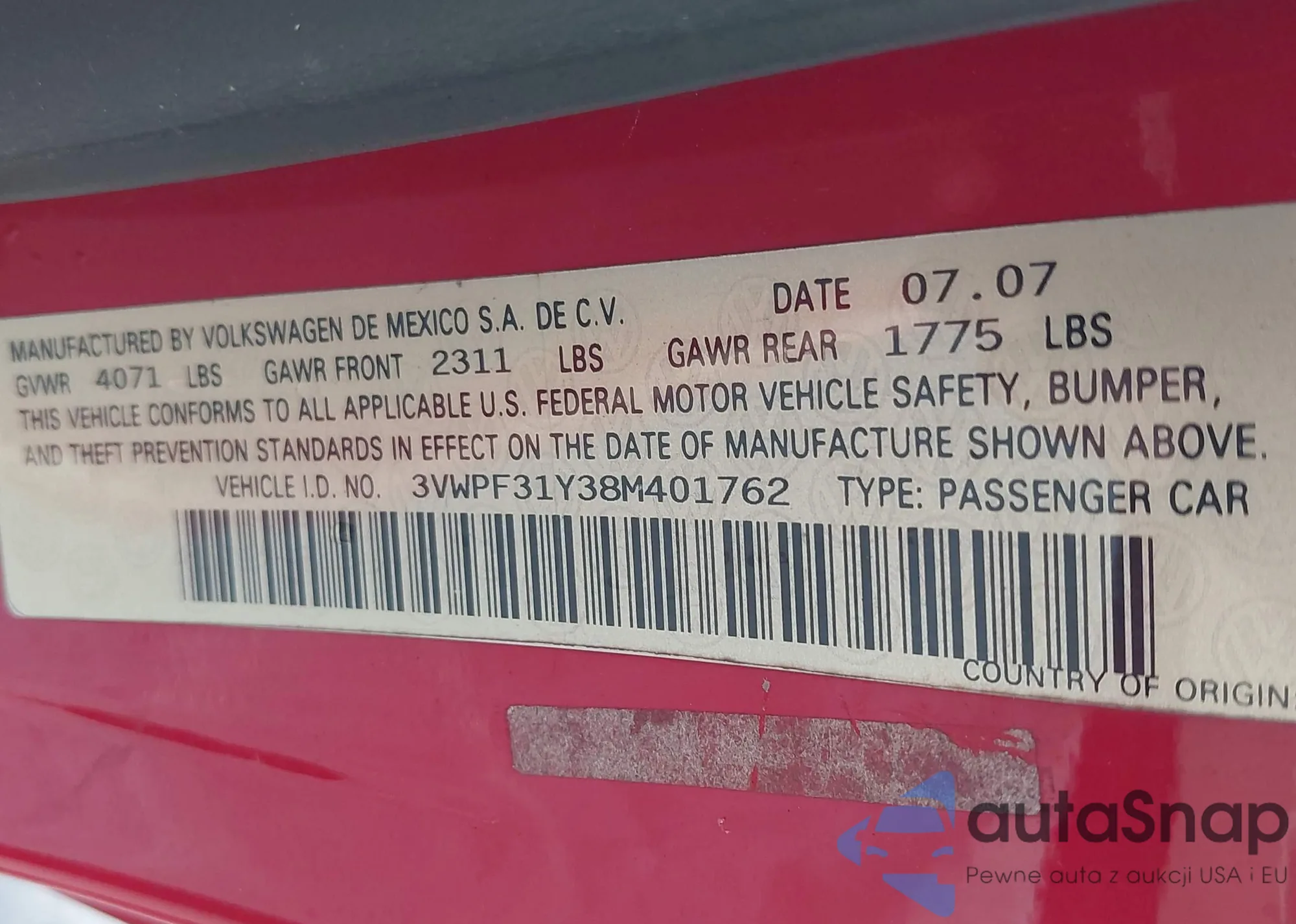 • VIN 3VWPF31Y38M401762
