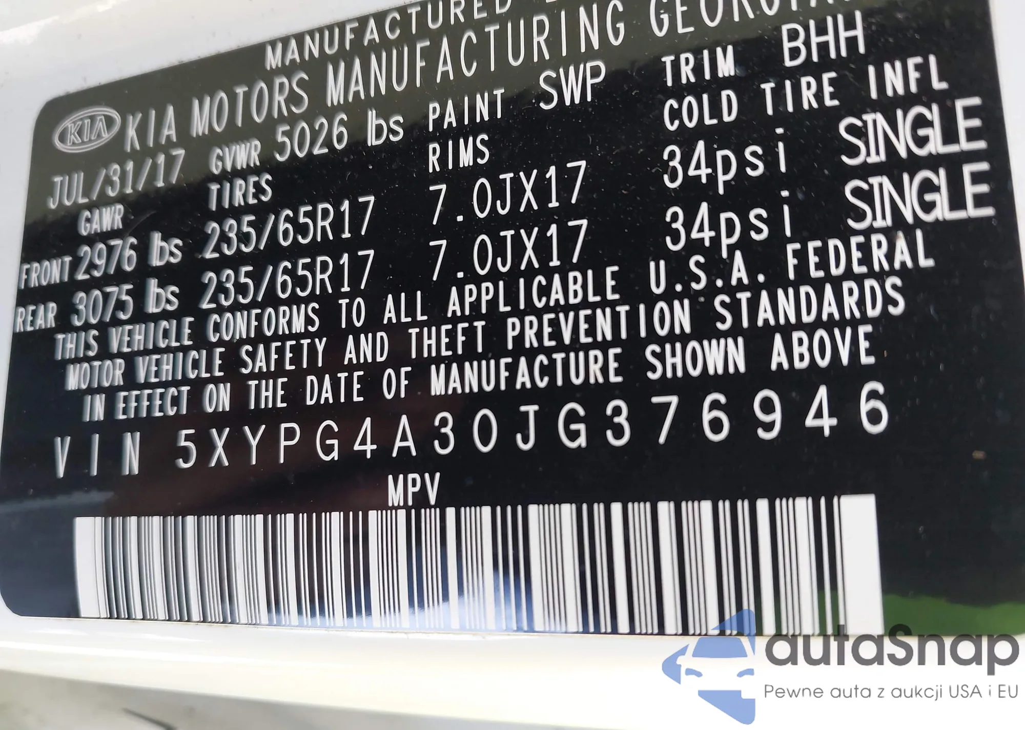 • VIN 5XYPG4A30JG376946