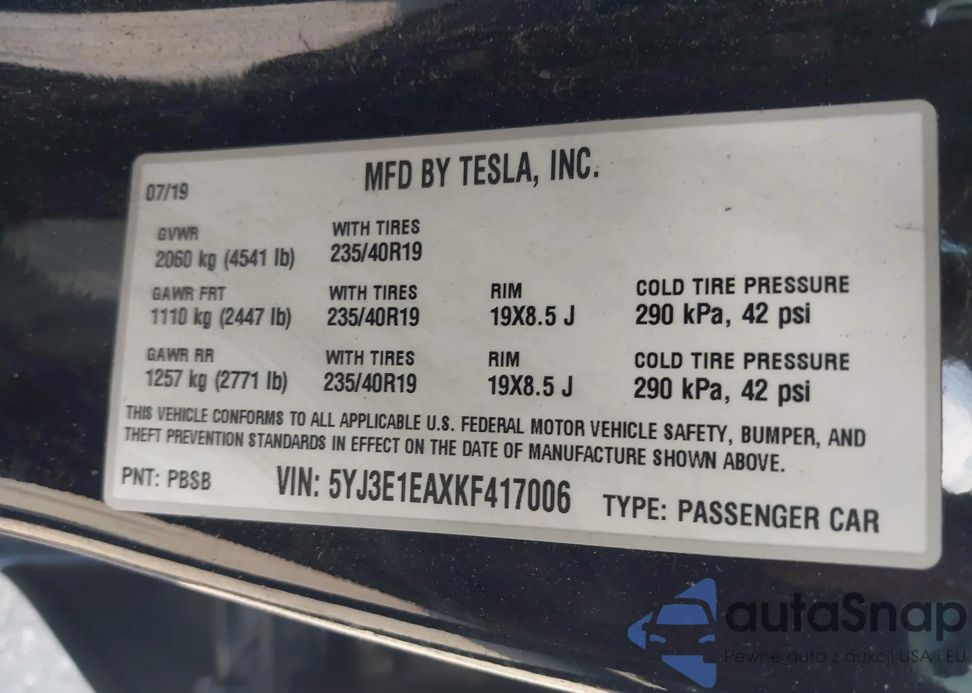 • VIN 5YJ3E1EAXKF417006