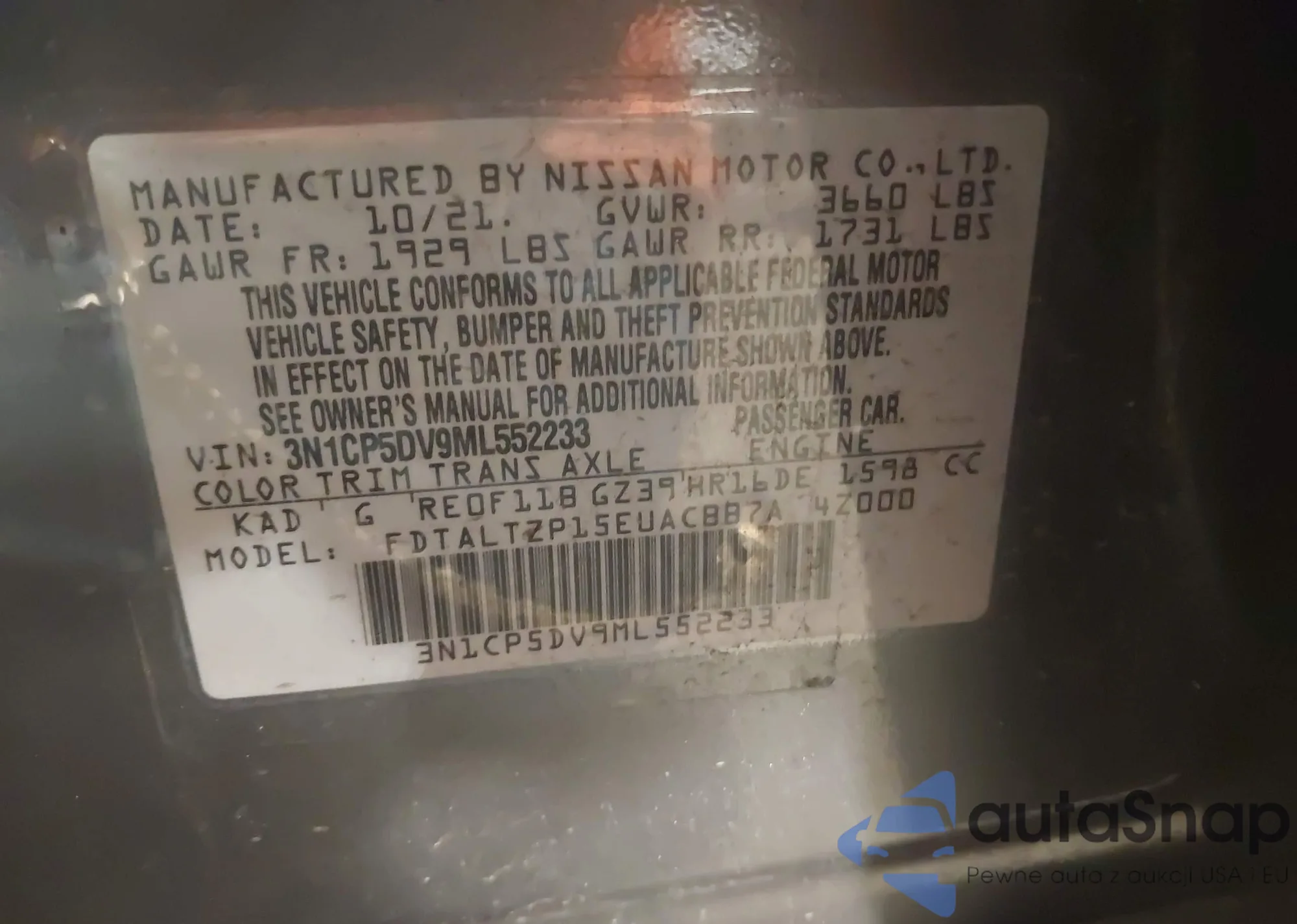 LOT: 42486192 VIN: 3N1CP5DV9ML552233