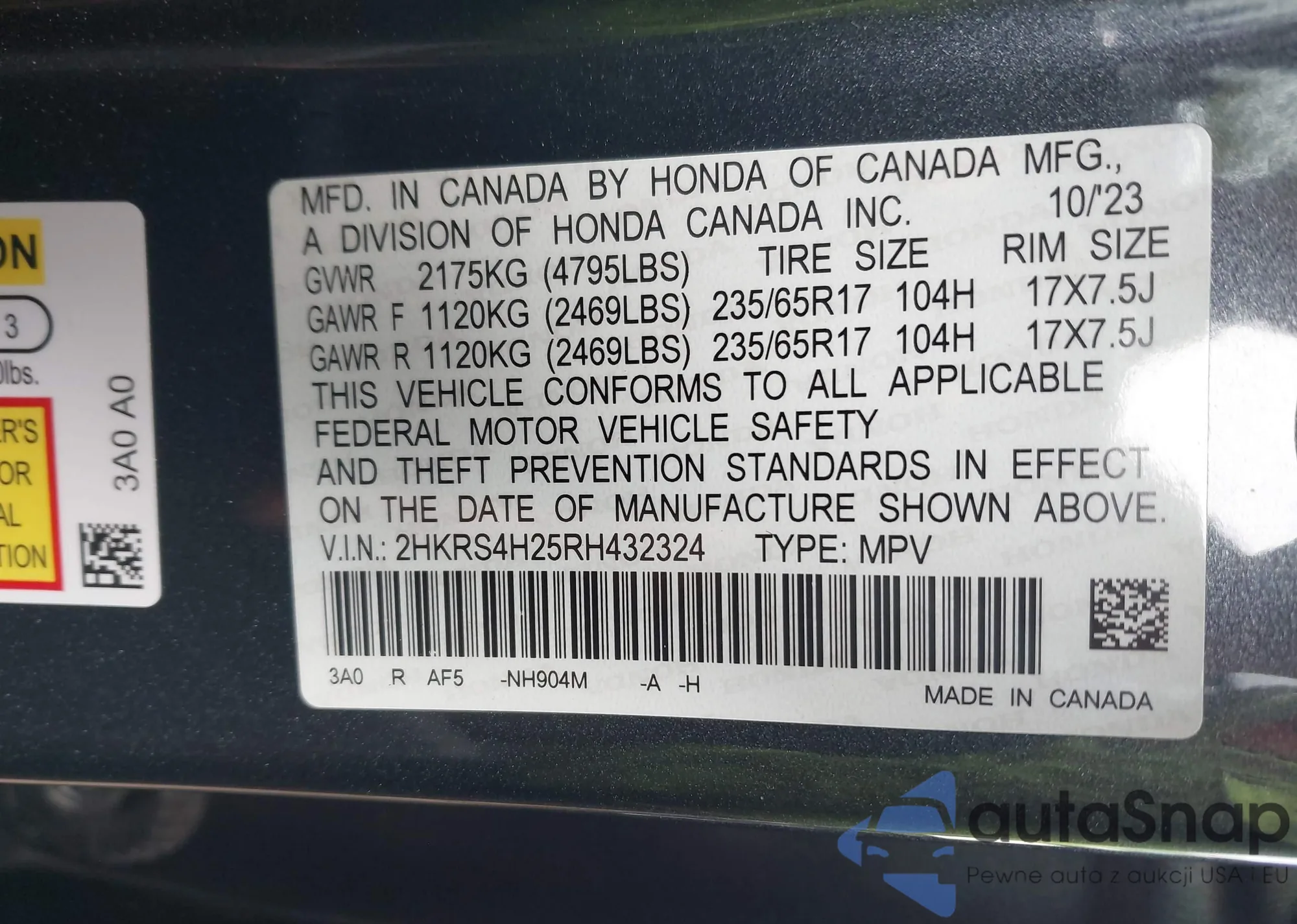 • VIN 2HKRS4H25RH432324