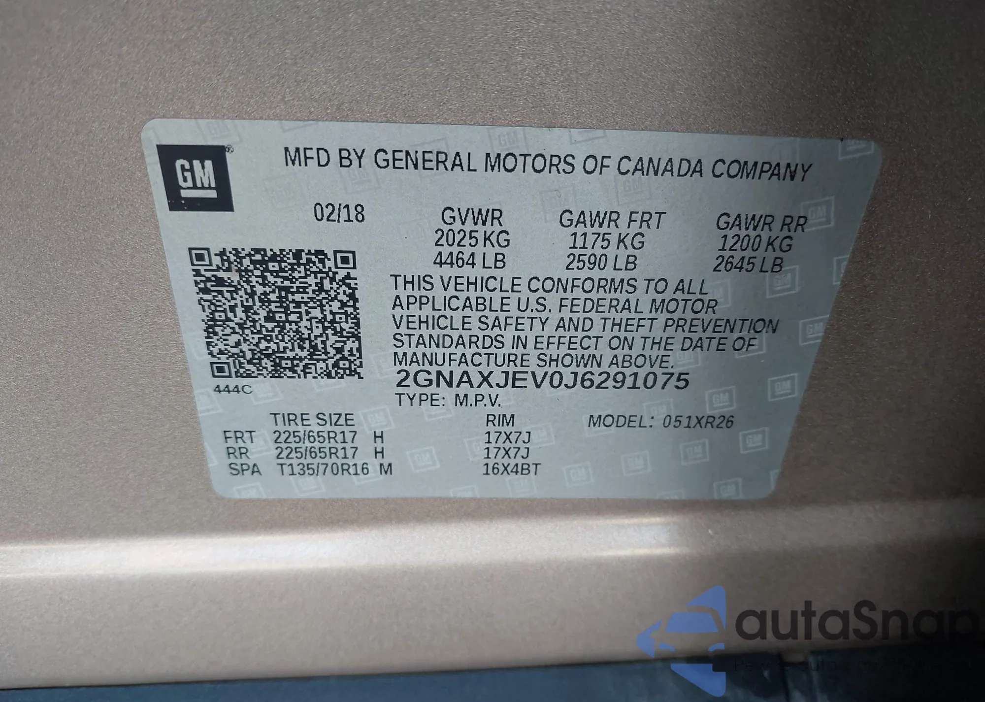 LOT: 42126560 VIN: 2GNAXJEV0J6291075