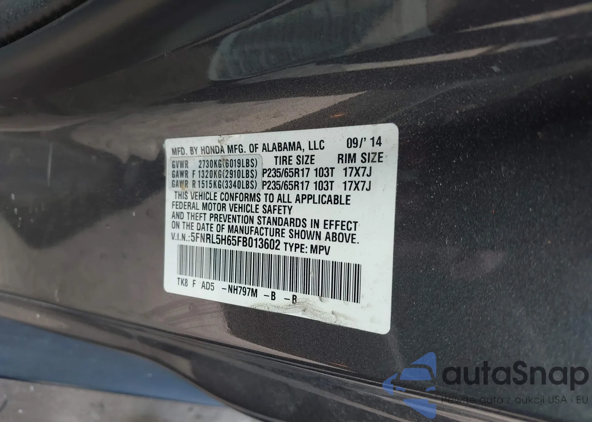 • VIN 5FNRL5H65FB013602