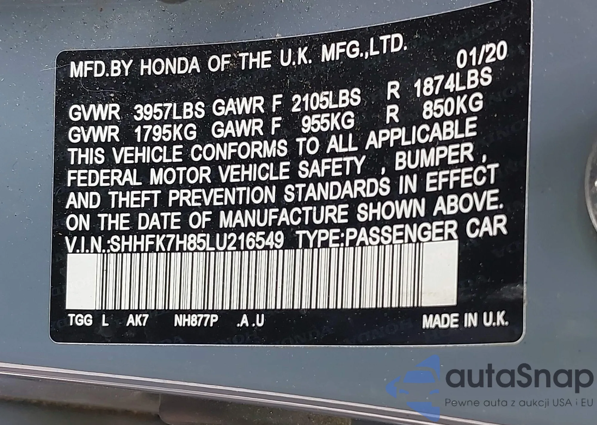 • VIN SHHFK7H85LU216549