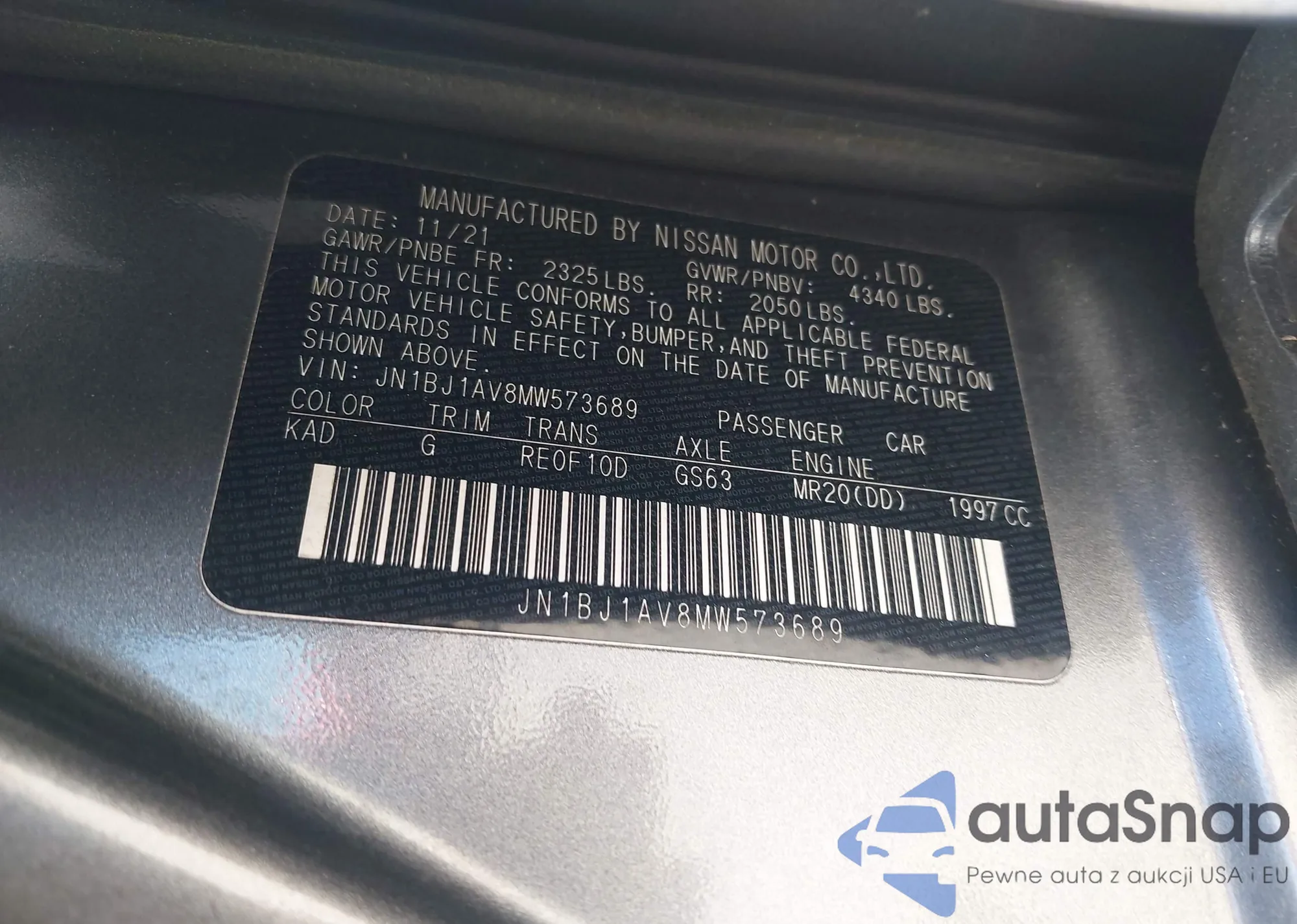 LOT: 42640389 VIN: JN1BJ1AV8MW573689