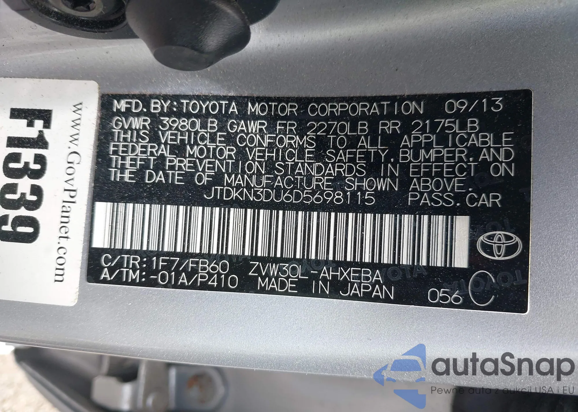 LOT: 42652546 VIN: JTDKN3DU6D5698115