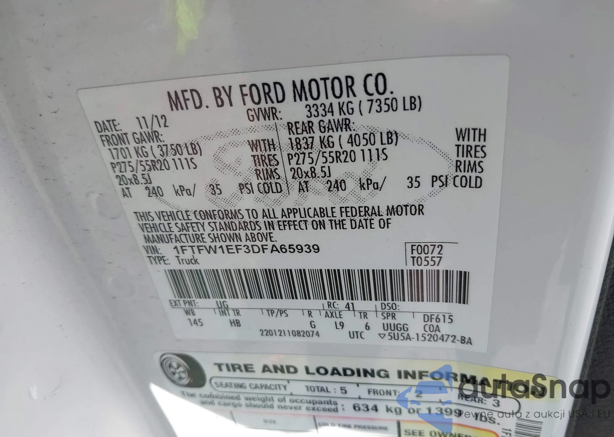 • VIN 1FTFW1EF3DFA65939