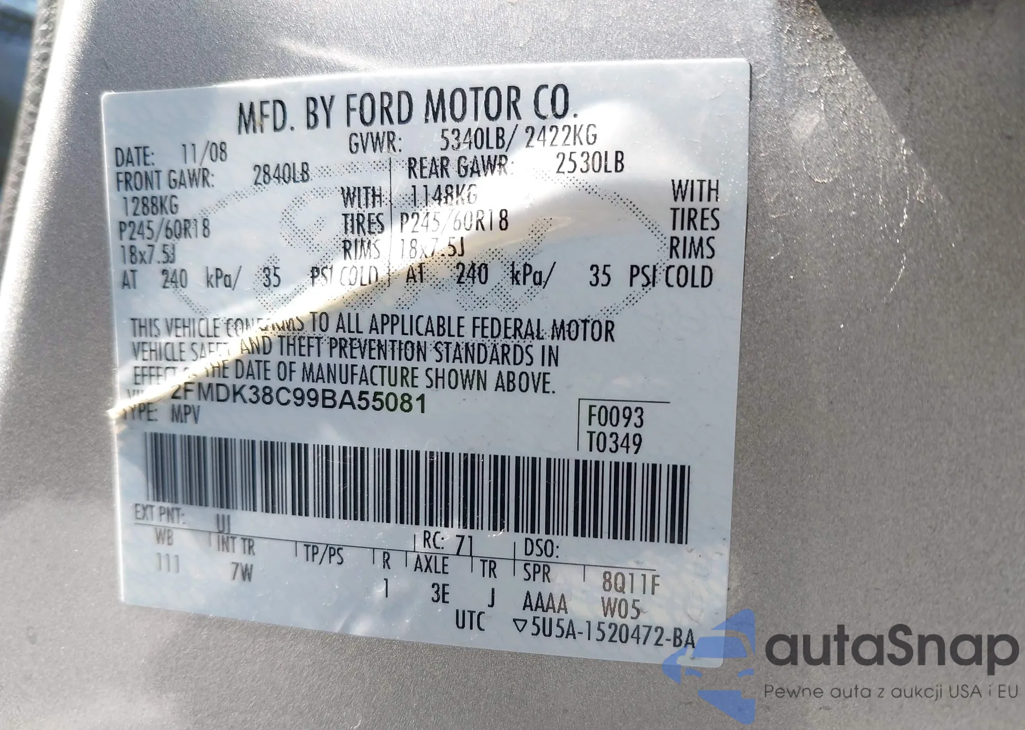 LOT: 42617536 VIN: 2FMDK38C99BA55081