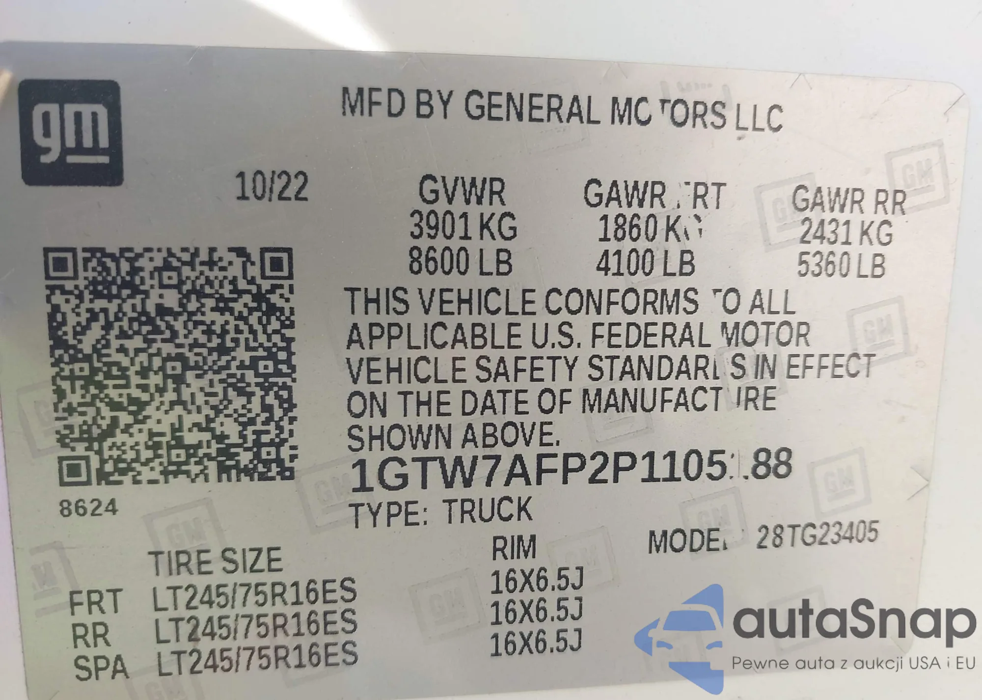 LOT: 42468430 VIN: 1GTW7AFP2P1105188