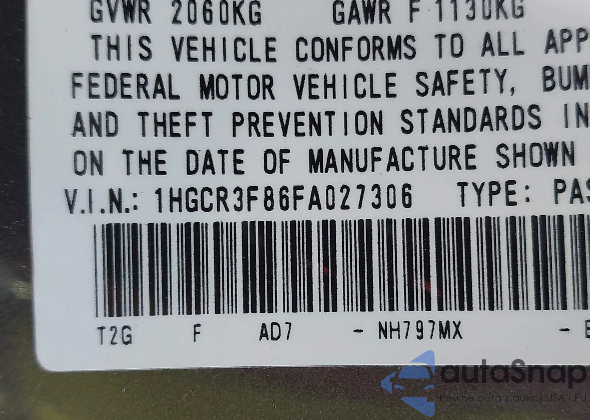 • VIN 1HGCR3F86FA027306
