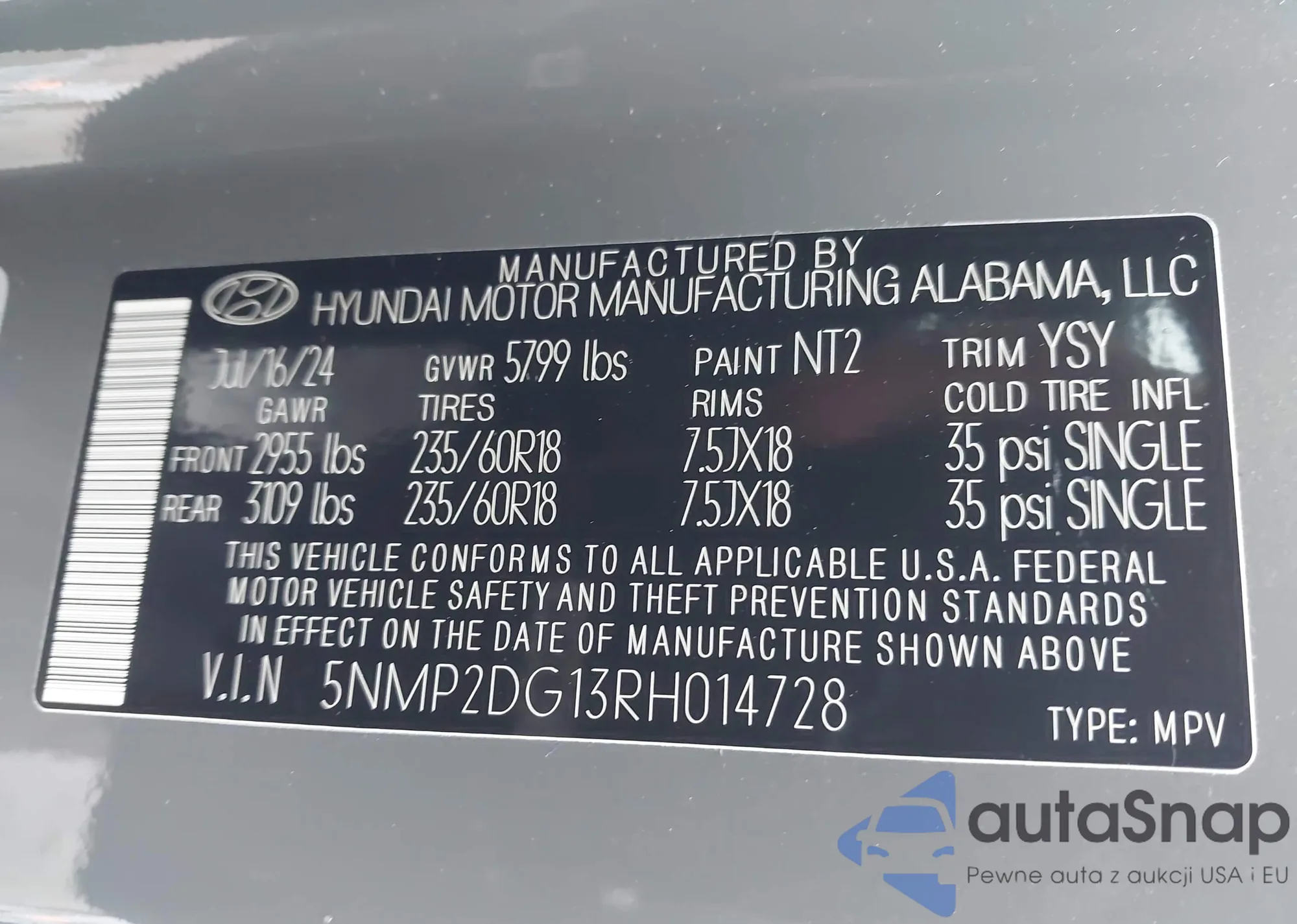 LOT: 42837648 VIN: 5NMP2DG13RH014728