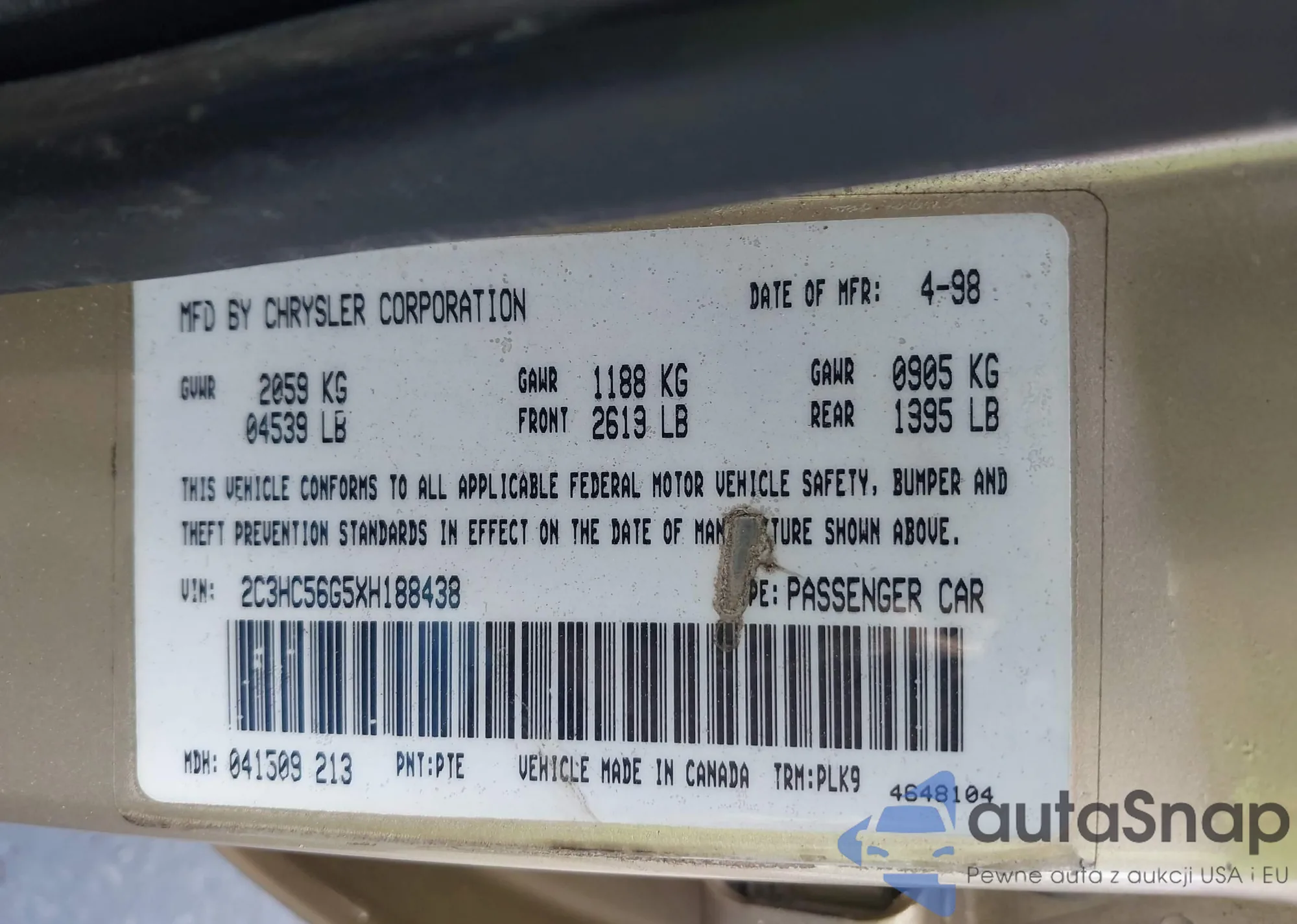 LOT: 42414384 VIN: 2C3HC56G5XH188438
