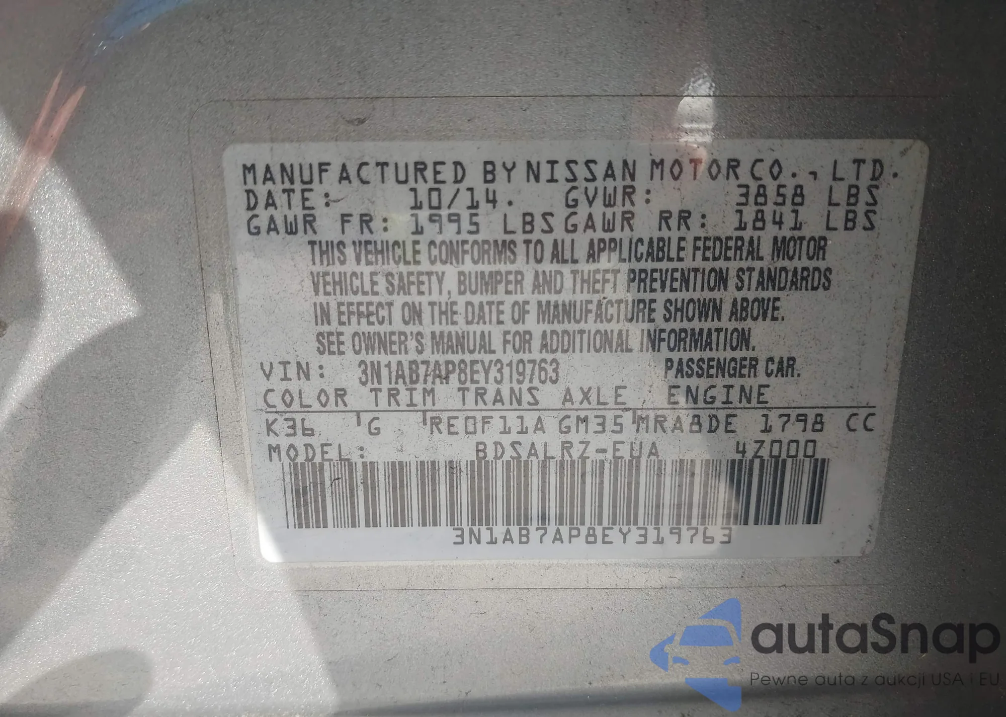 LOT: 42742217 VIN: 3N1AB7AP8EY319763