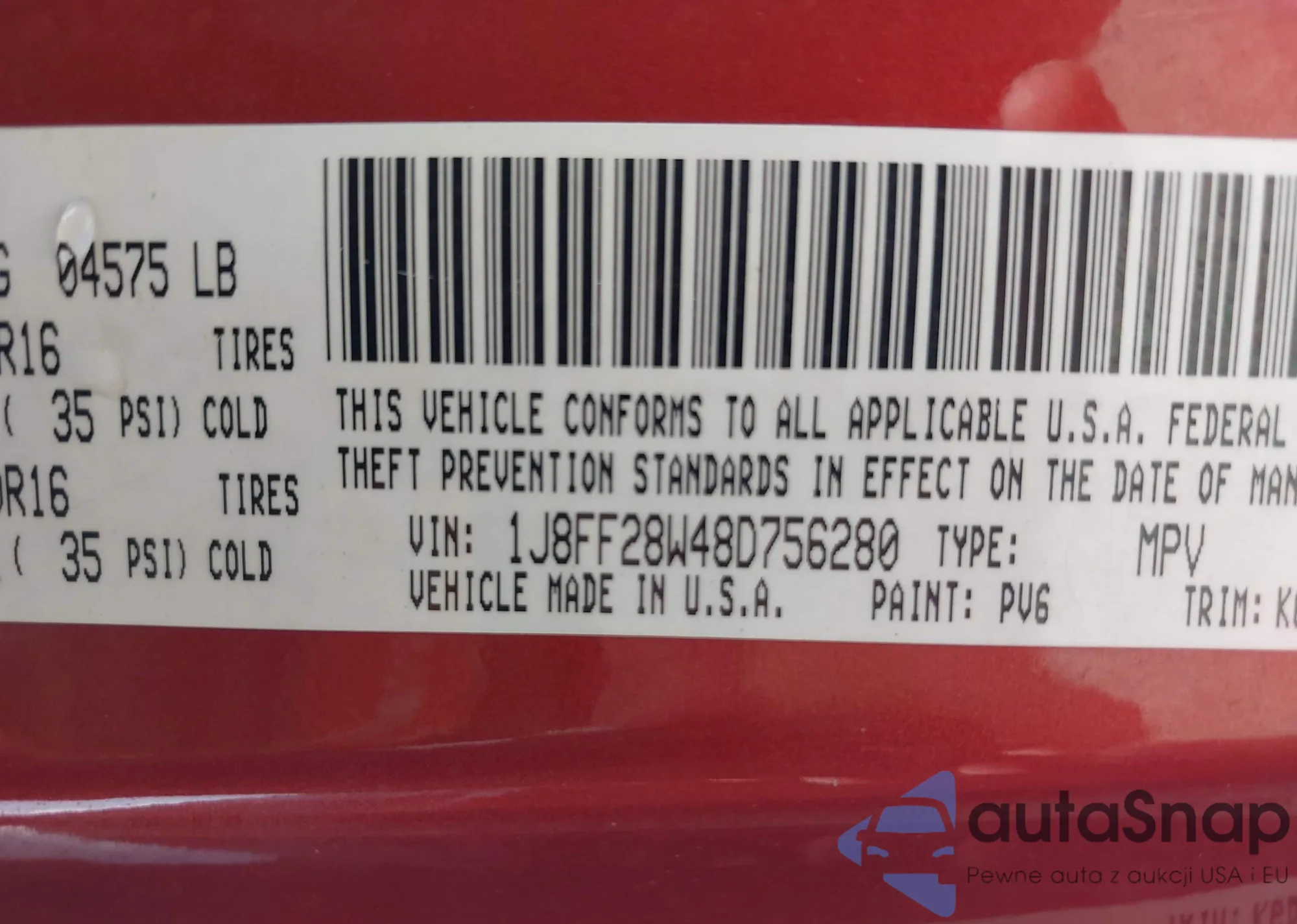 LOT: 42813229 VIN: 1J8FF28W48D756280