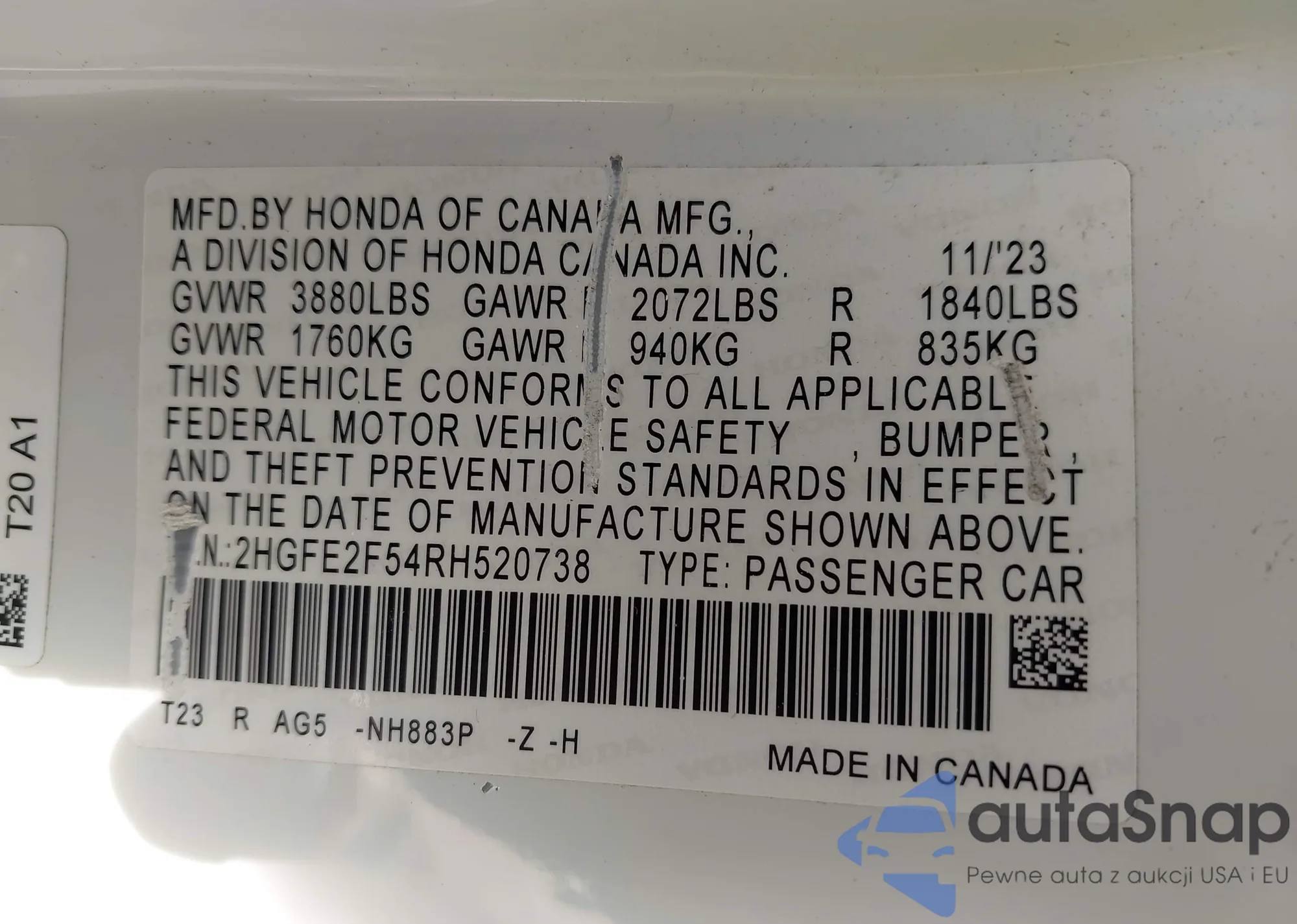 LOT: 42335951 VIN: 2HGFE2F54RH520738