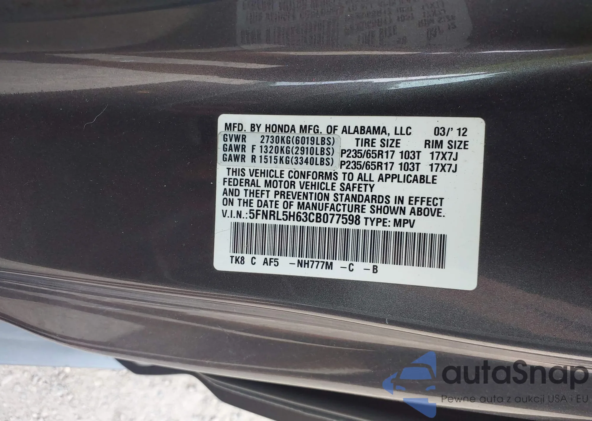 • VIN 5FNRL5H63CB077598