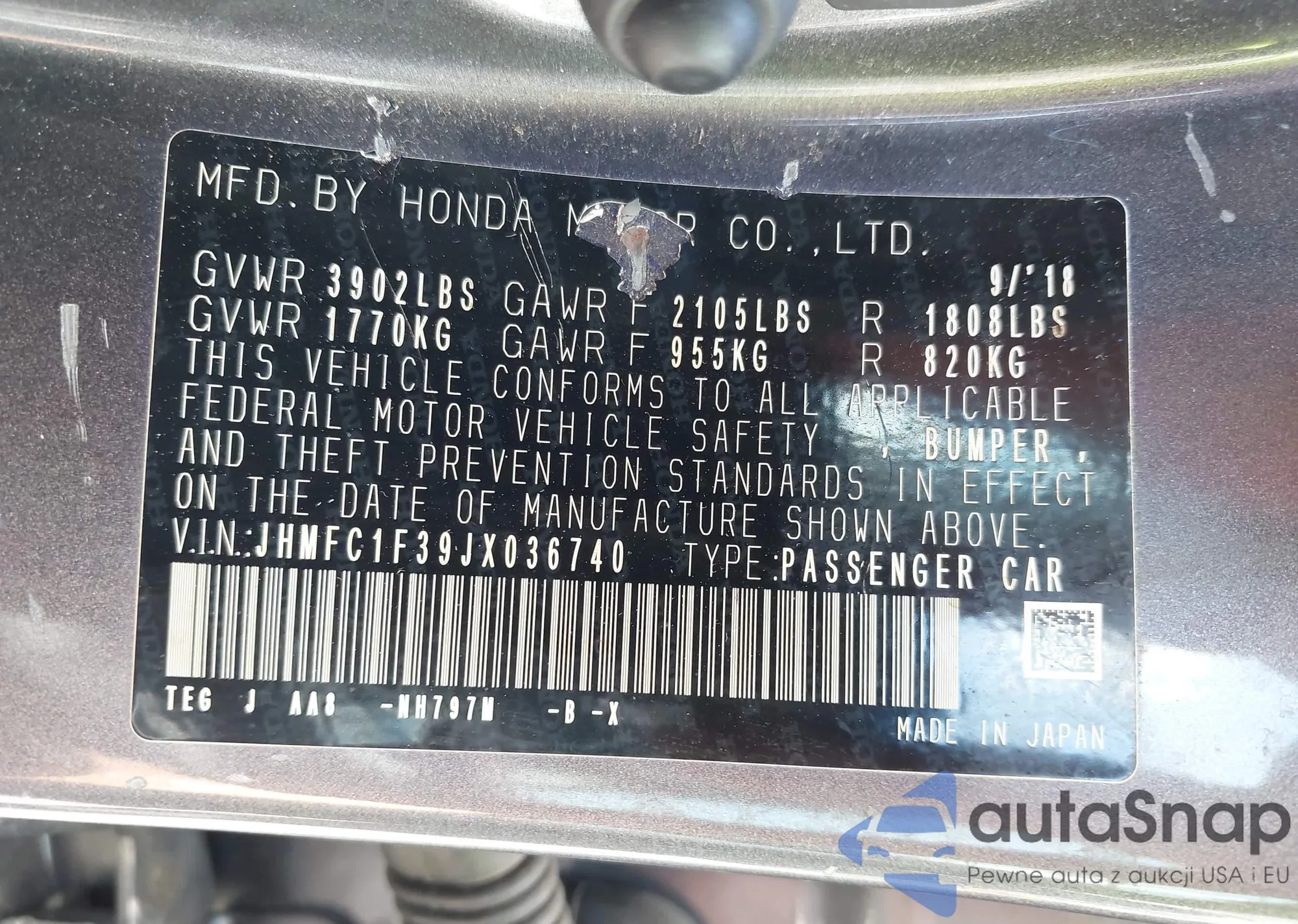 LOT: 42664642 VIN: JHMFC1F39JX036740