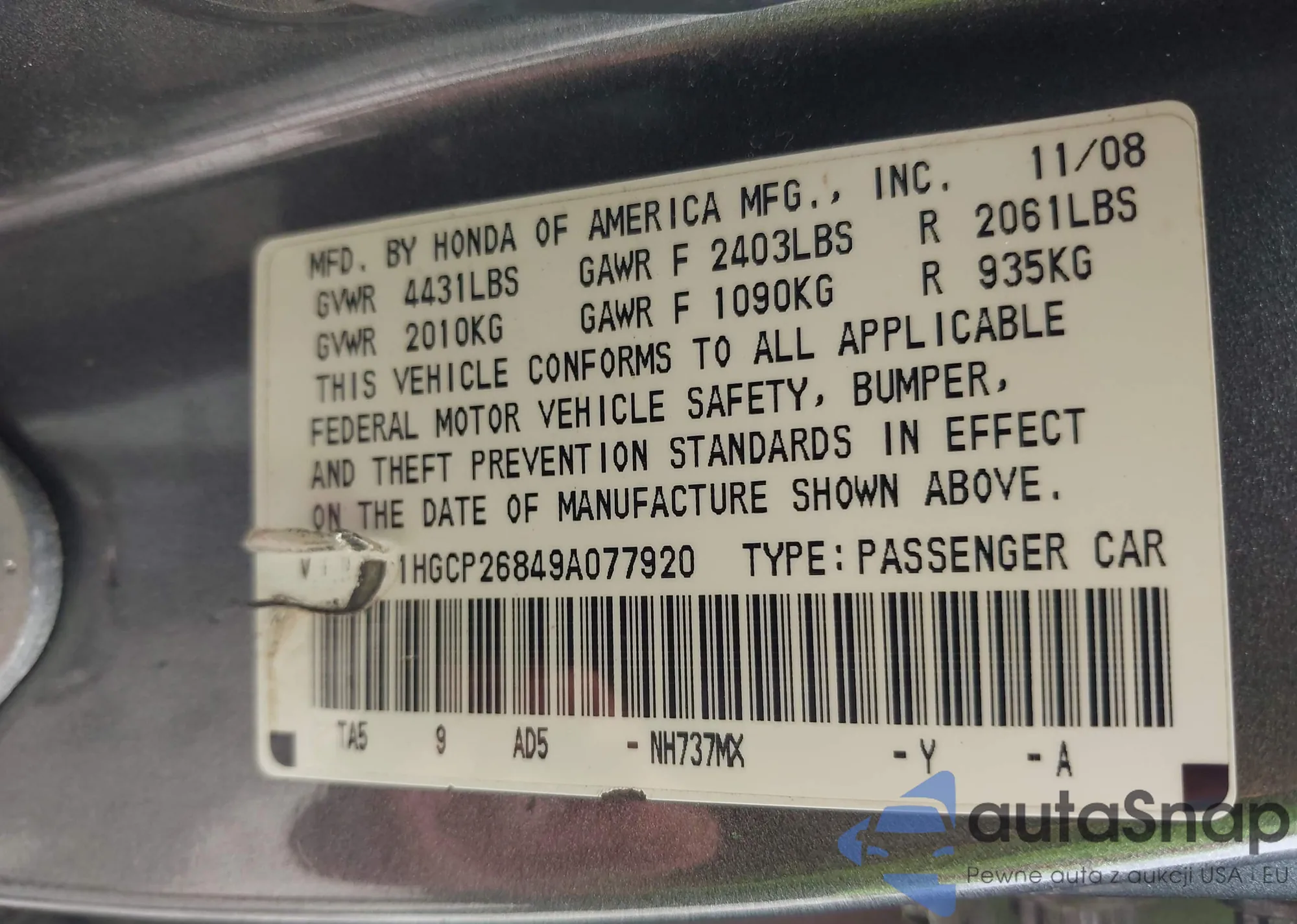 LOT: 42675810 VIN: 1HGCP26849A077920