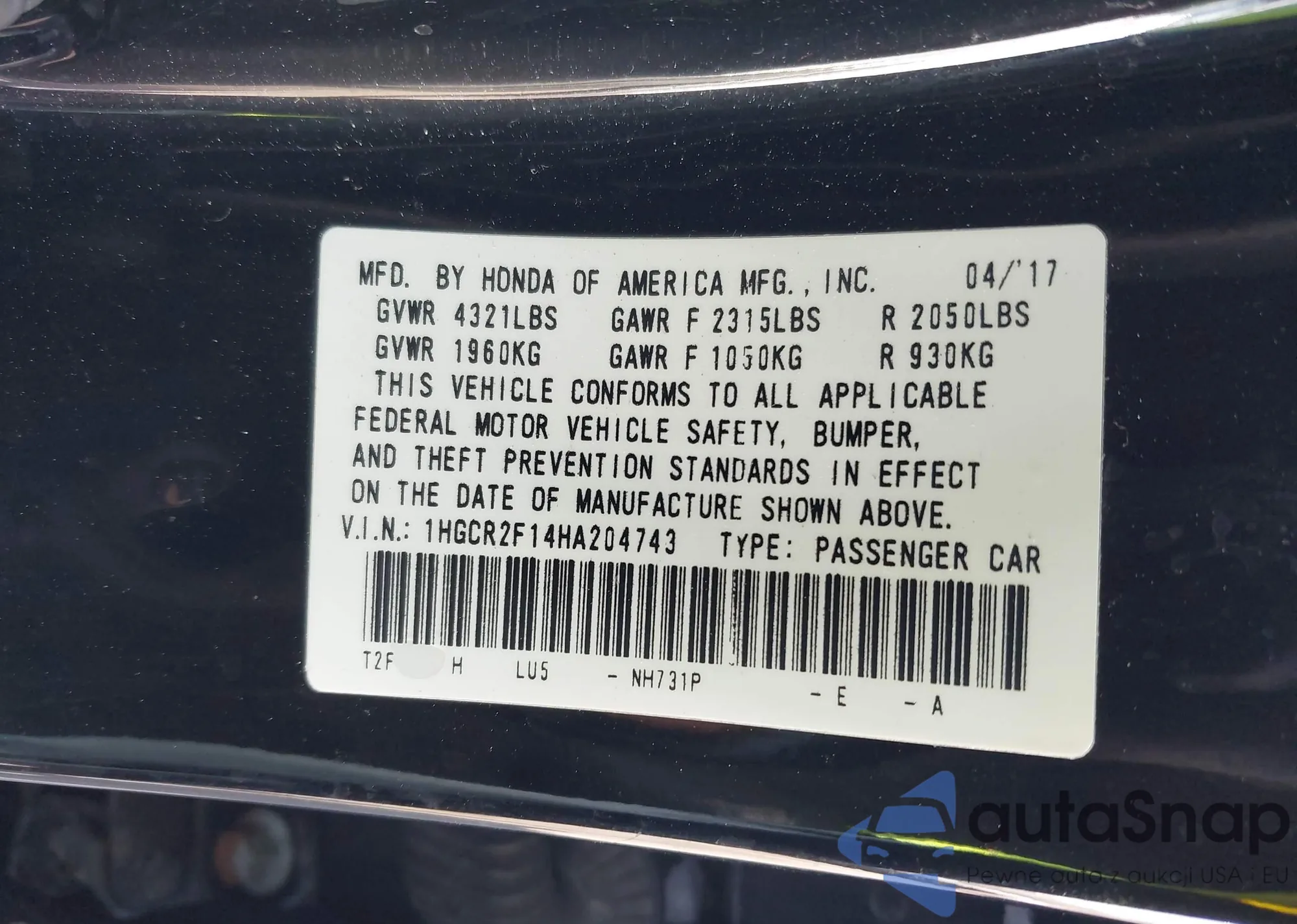 • VIN 1HGCR2F14HA204743