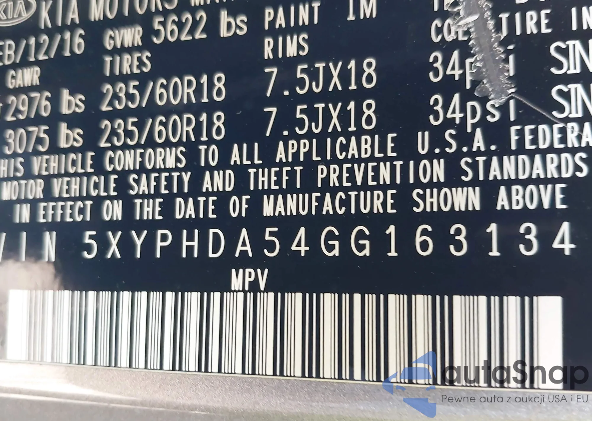 • VIN 5XYPHDA54GG163134