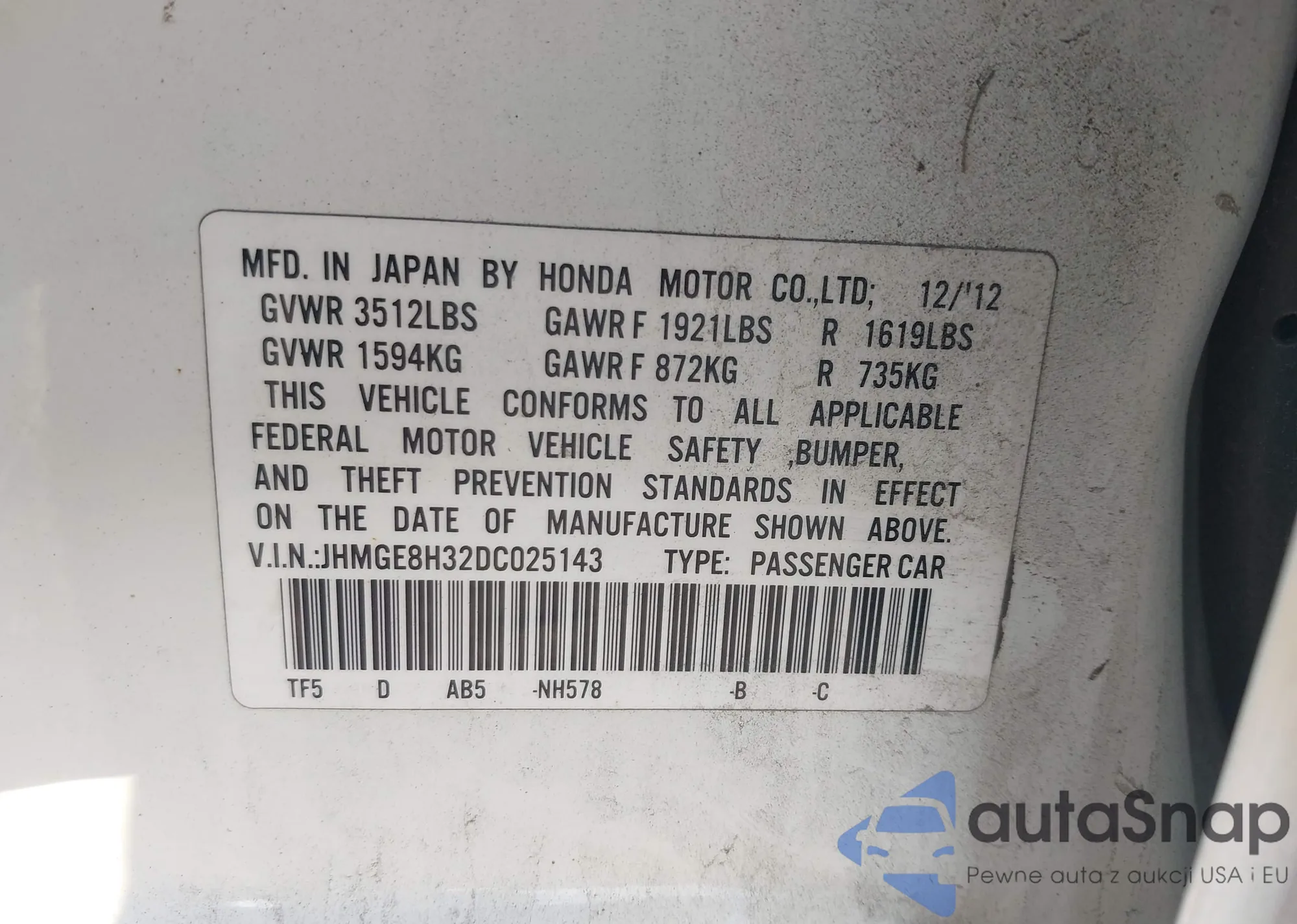 • VIN JHMGE8H32DC025143