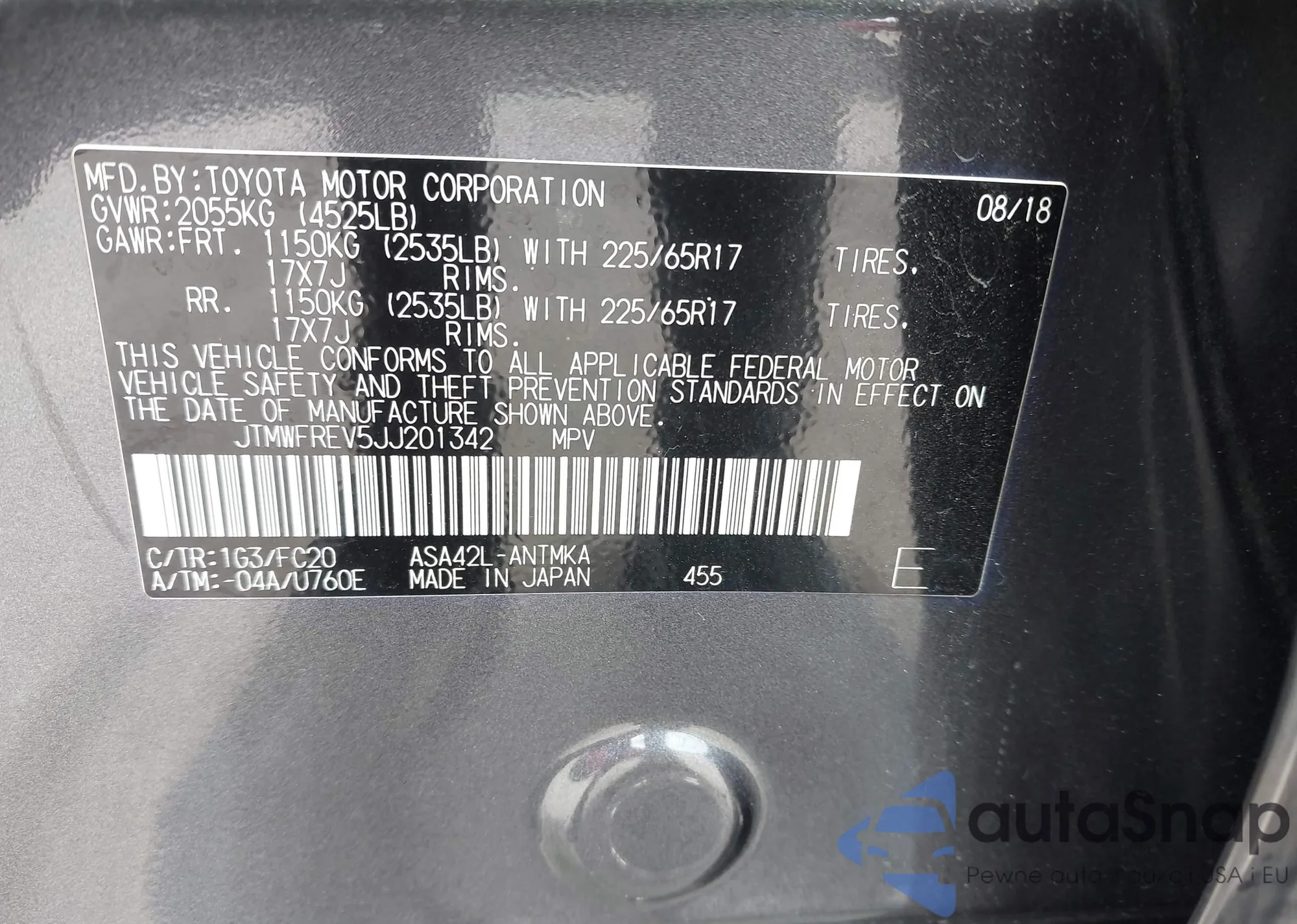 LOT: 42748227 VIN: JTMWFREV5JJ201342