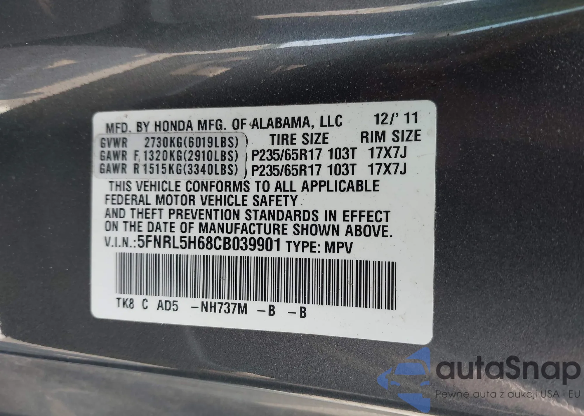 • VIN 5FNRL5H68CB039901
